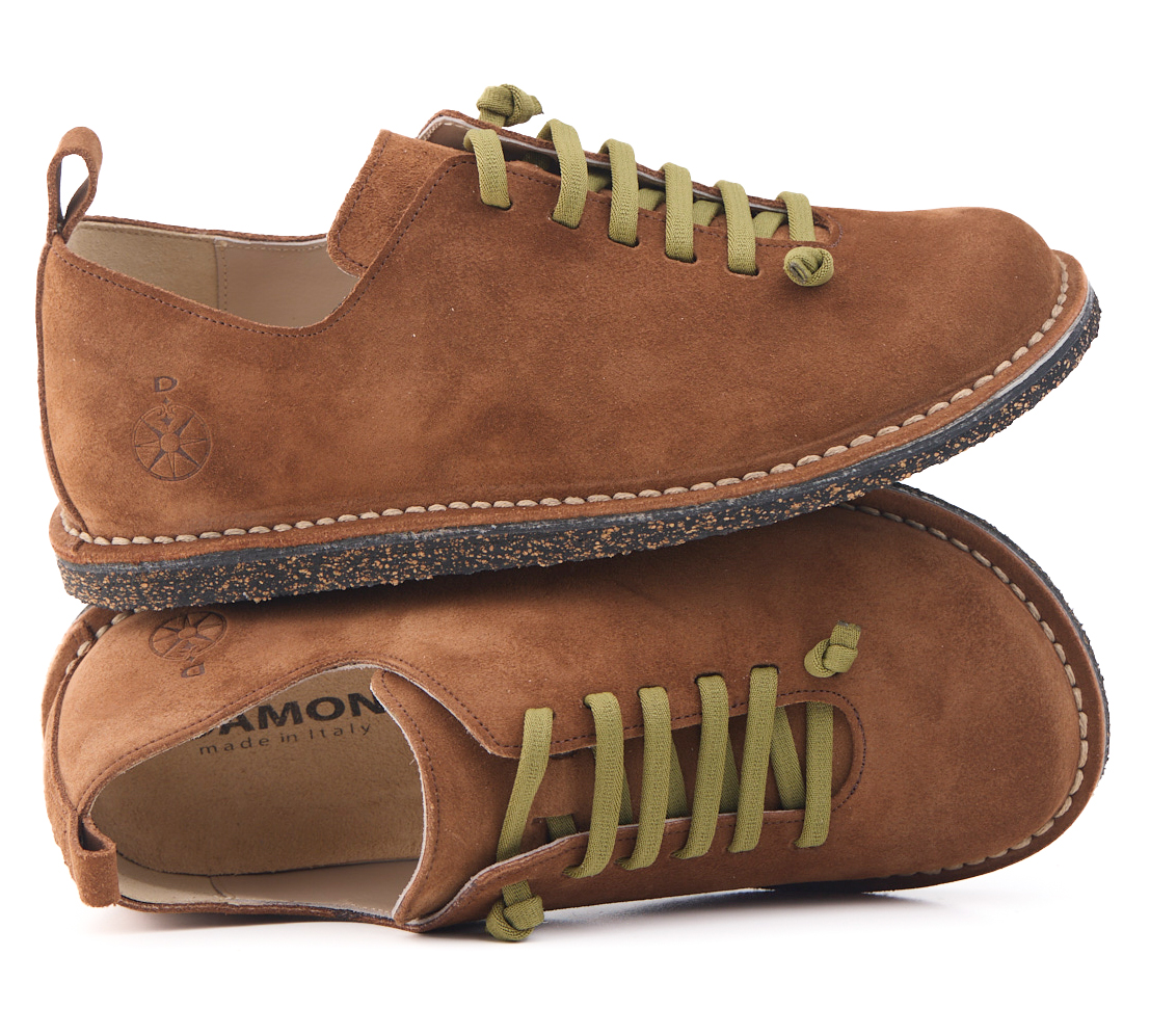 Scarpetta comfort in pelle scamosciata con lacci elastici e fodera in pelle vitello.