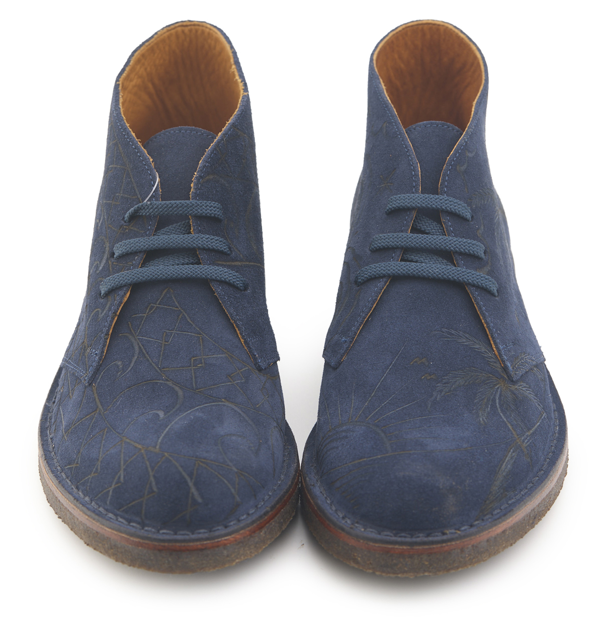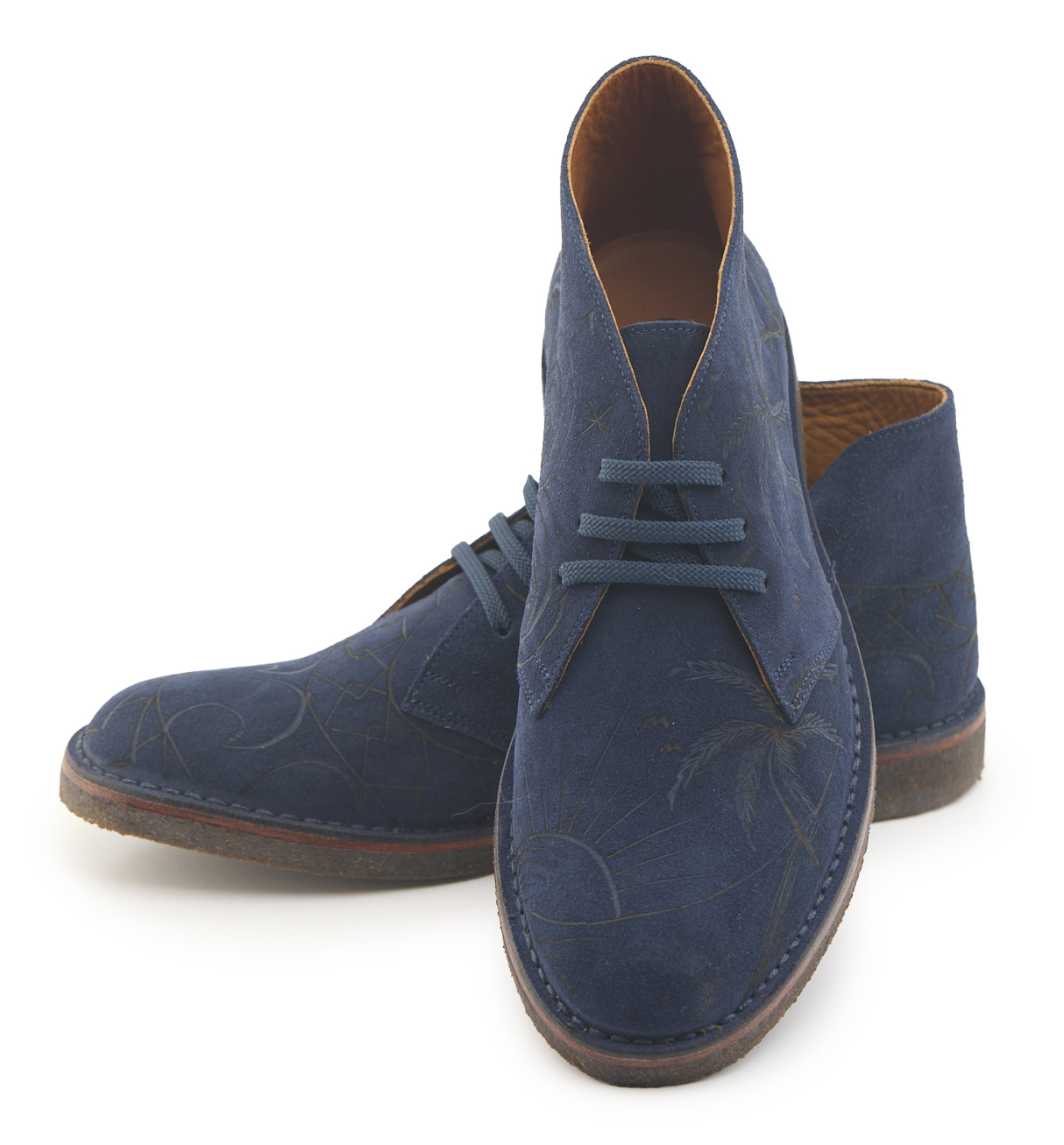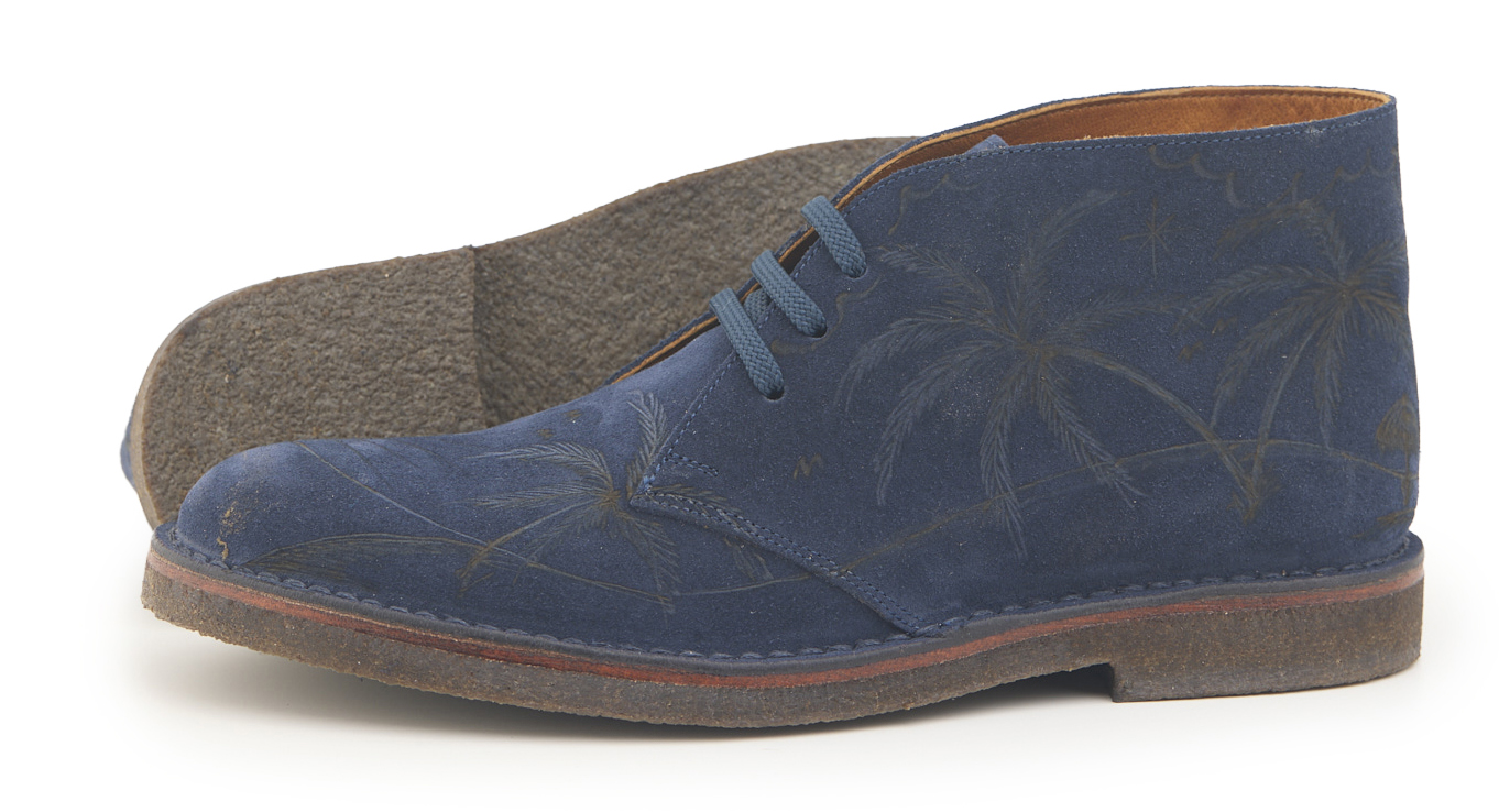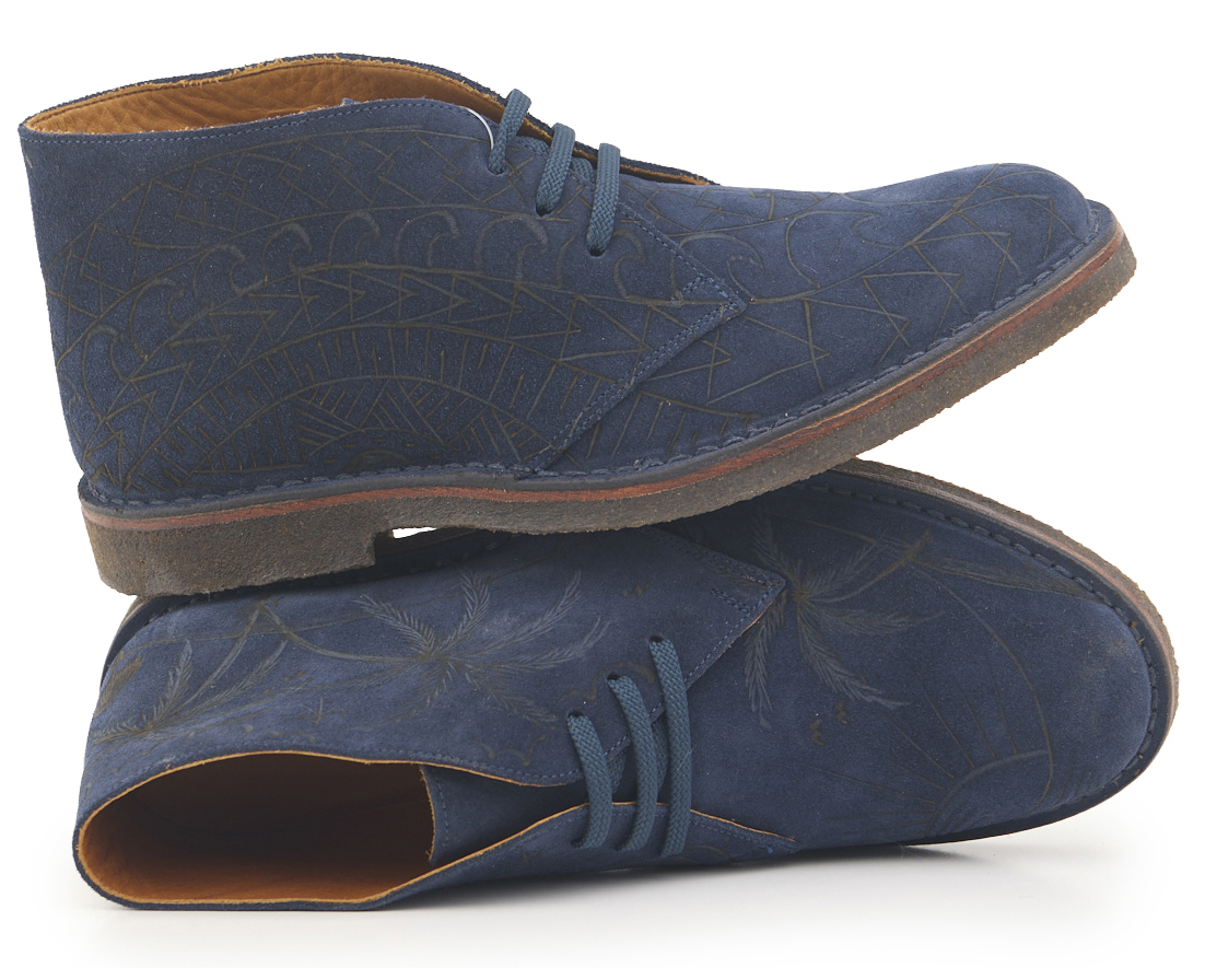 Polacchino comfort realizzato in pelle scamosciata color blu notte, fodera in pelle vitello e lacci in poliestere. Pirografato a mano da A.C Longboards con tema palme e Maori.