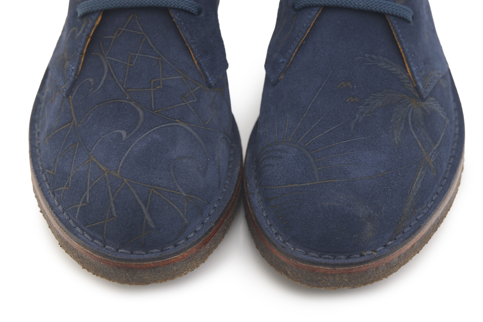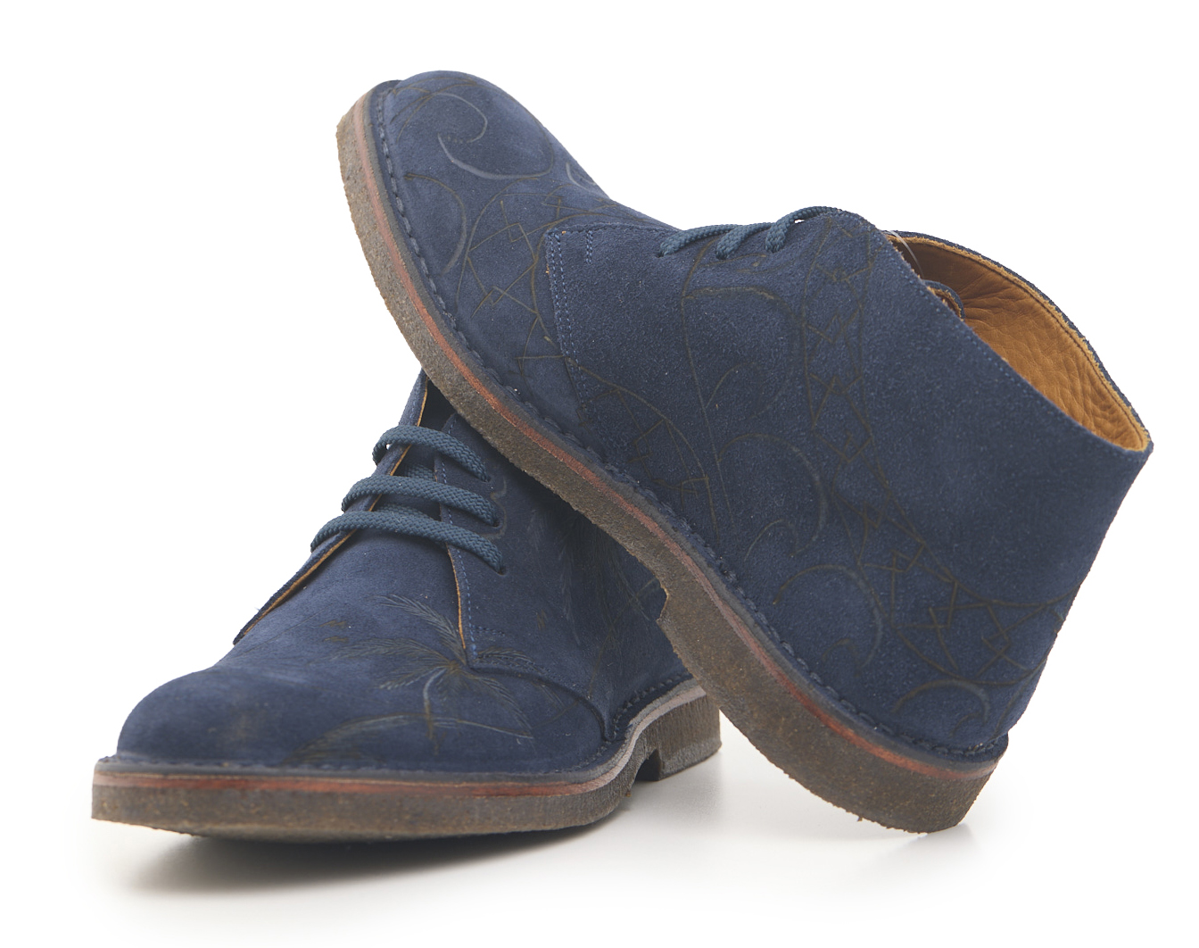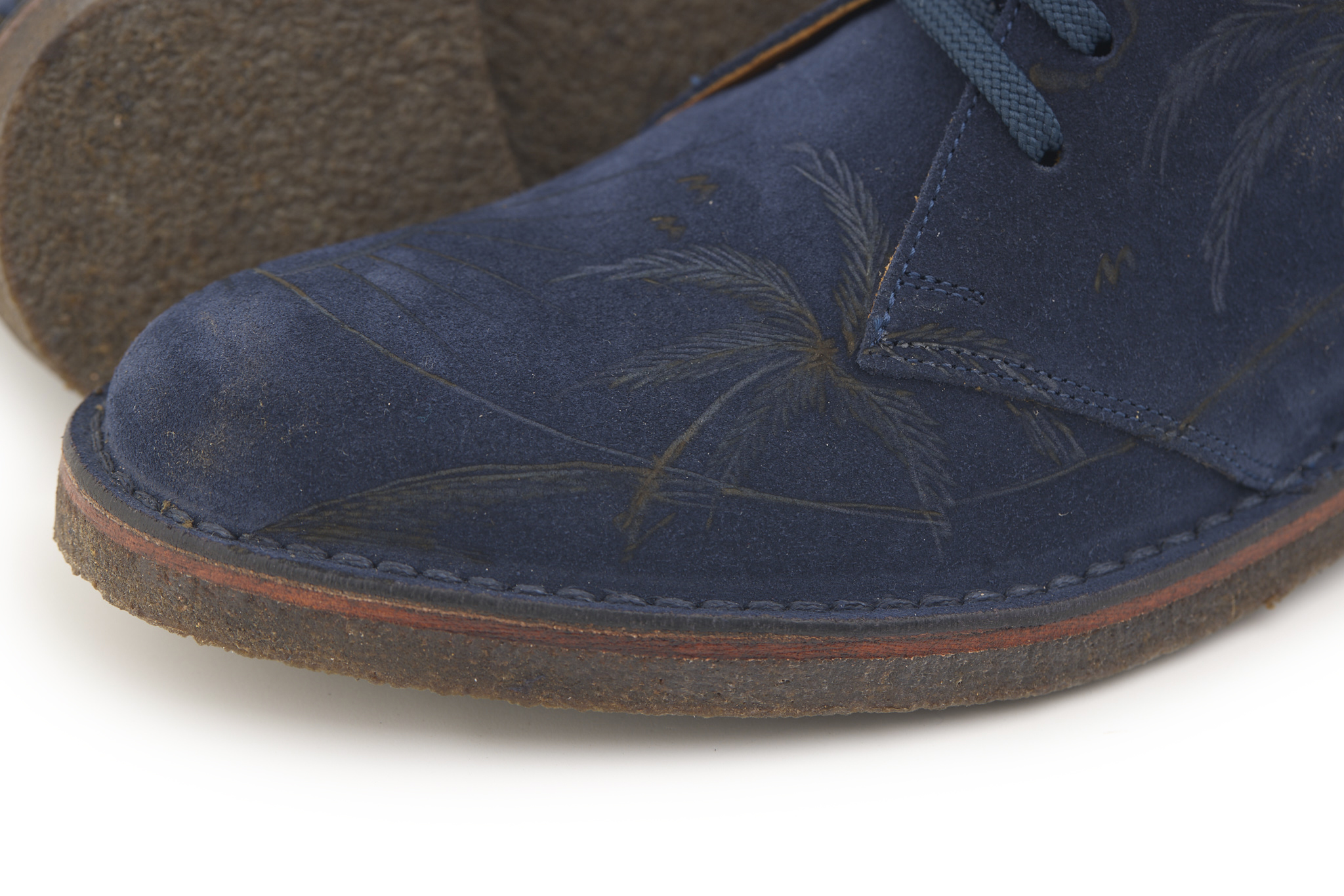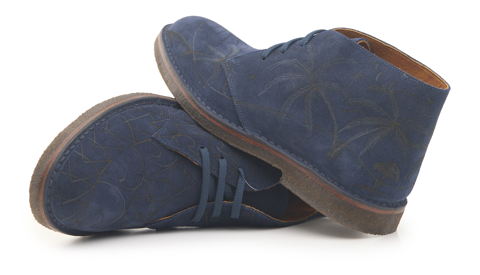 Polacchino comfort realizzato in pelle scamosciata color blu notte, fodera in pelle vitello e lacci in poliestere. Pirografato a mano da A.C Longboards con tema palme e Maori.