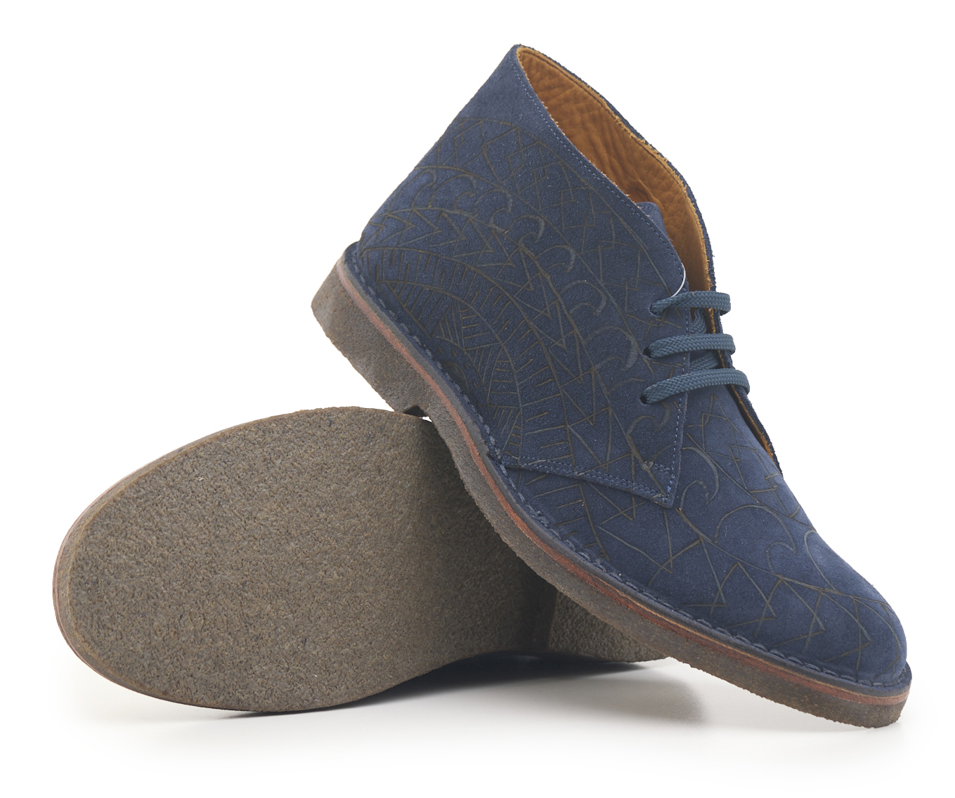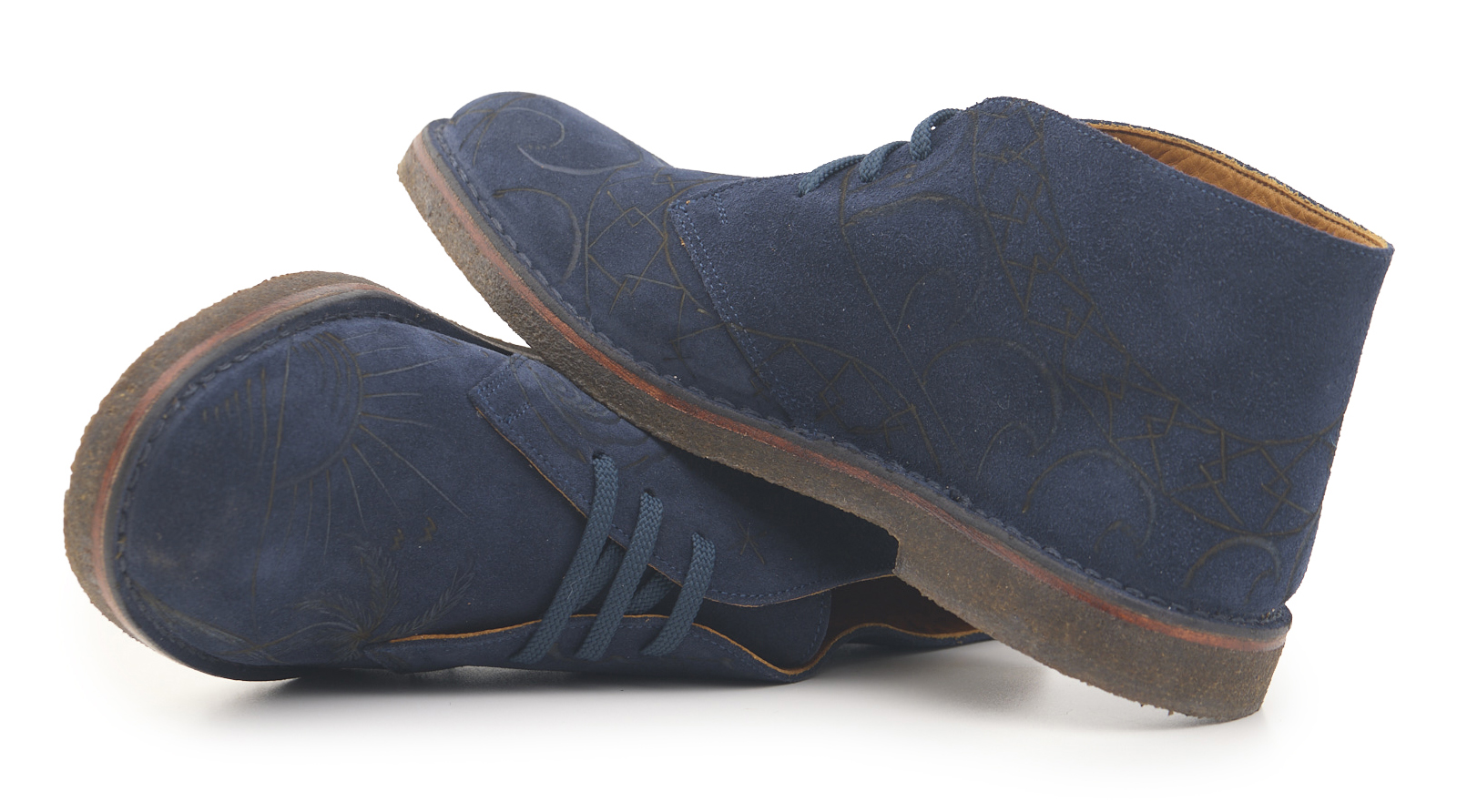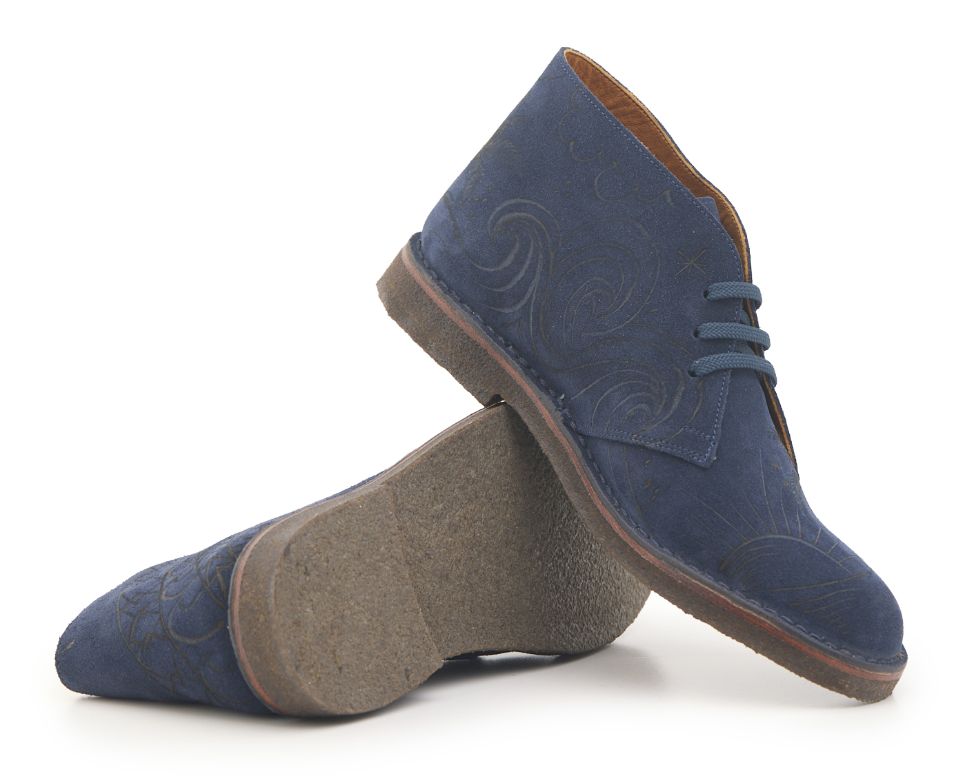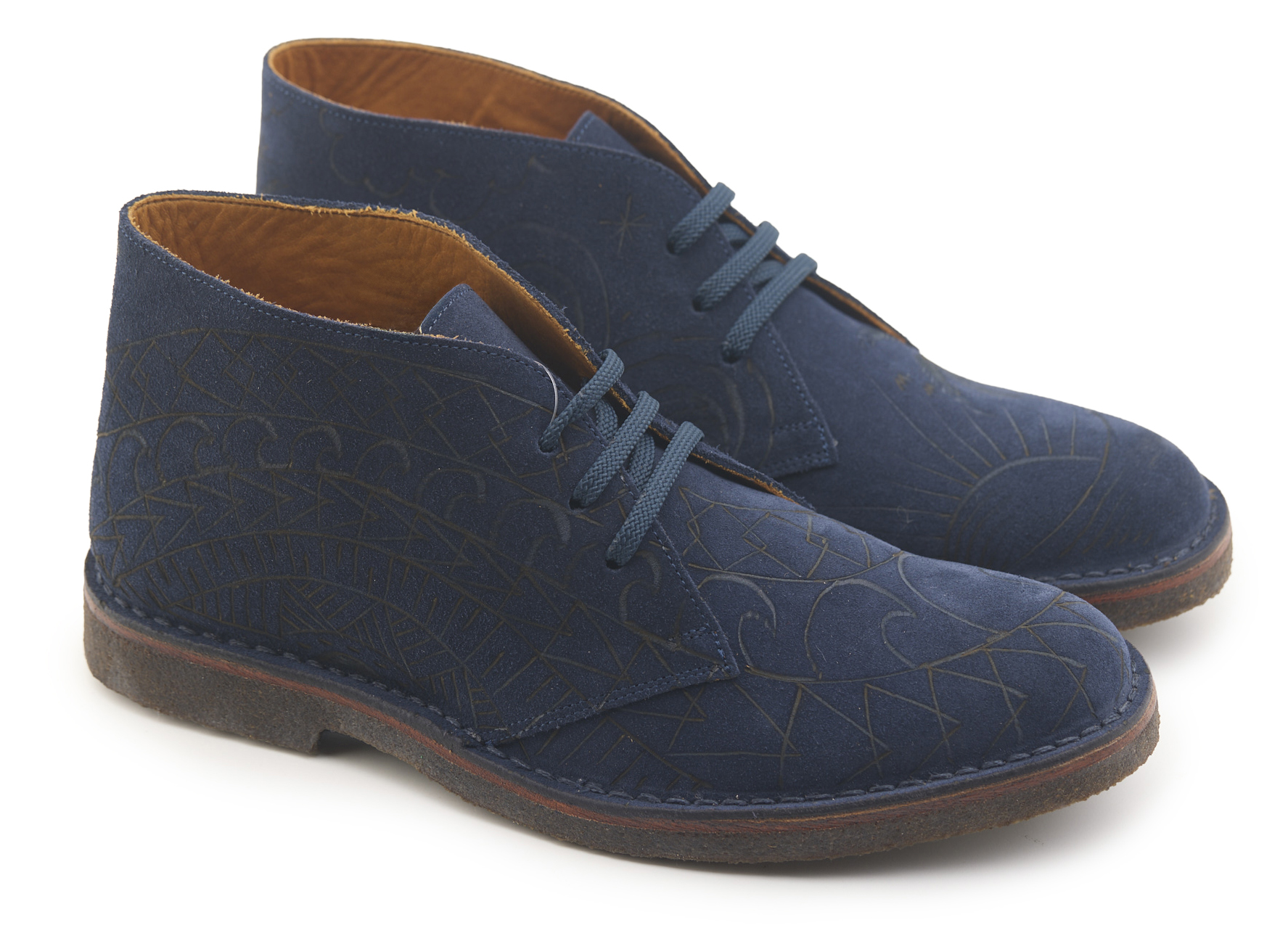 Polacchino comfort realizzato in pelle scamosciata color blu notte, fodera in pelle vitello e lacci in poliestere. Pirografato a mano da A.C Longboards con tema palme e Maori.