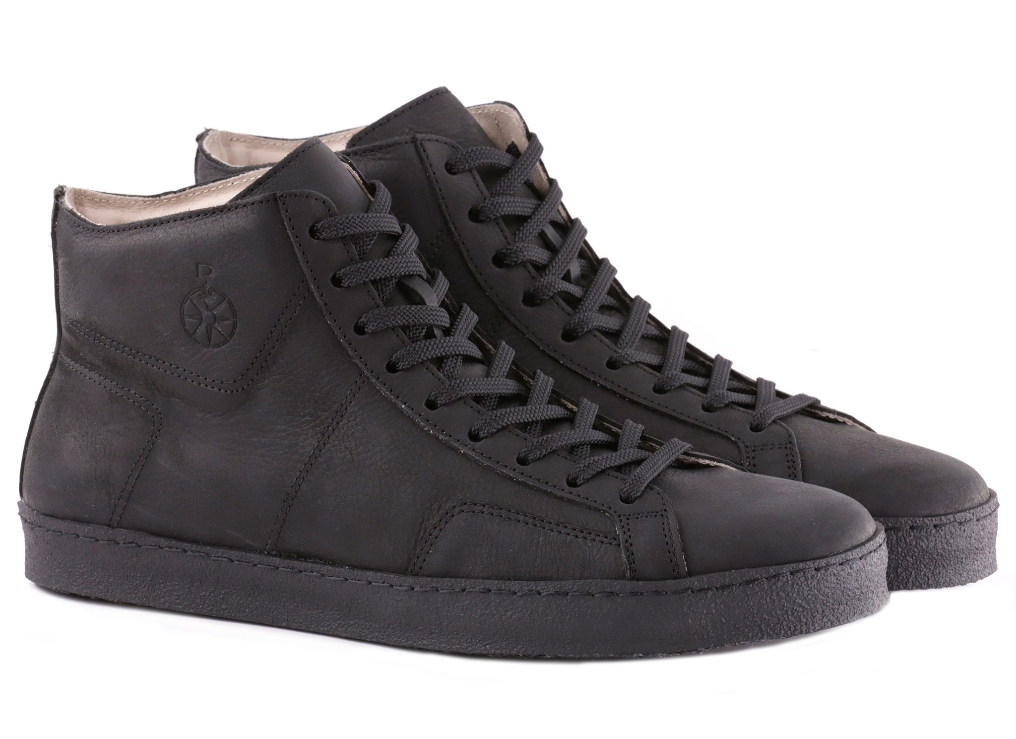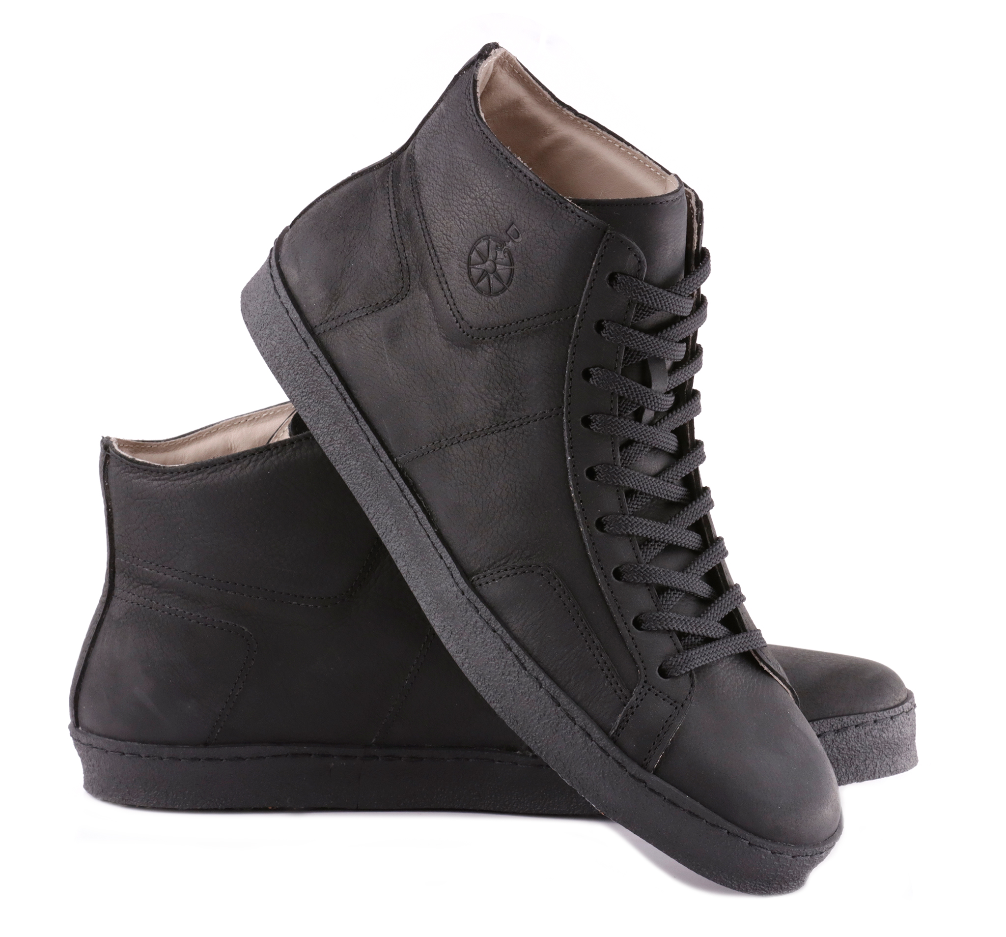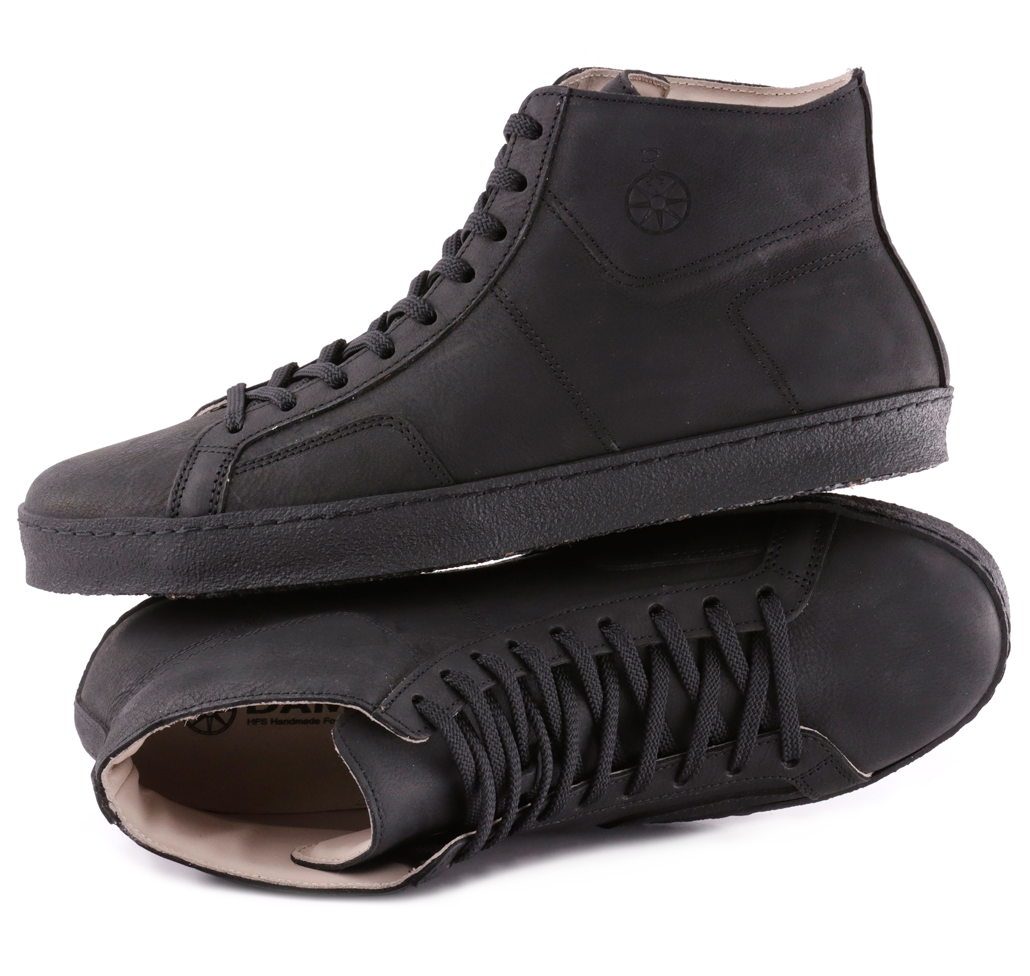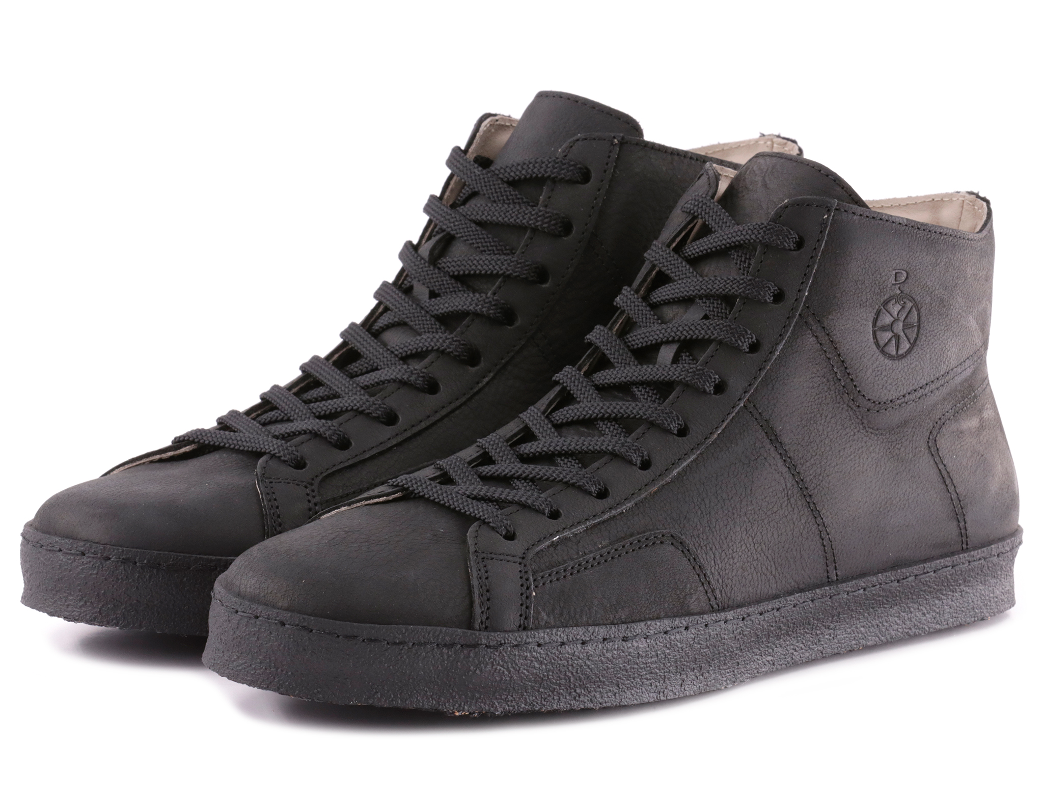 Sneakers alte in pelle ingrassata e bottalata, lacci poliestere di qualità, fodera in pelle vitello.