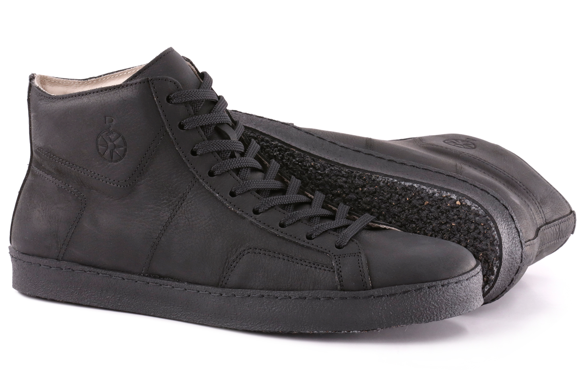 Sottopiede estraibile rivestito in pelle, suola gomma naturale riciclata con striscia nera gommata.