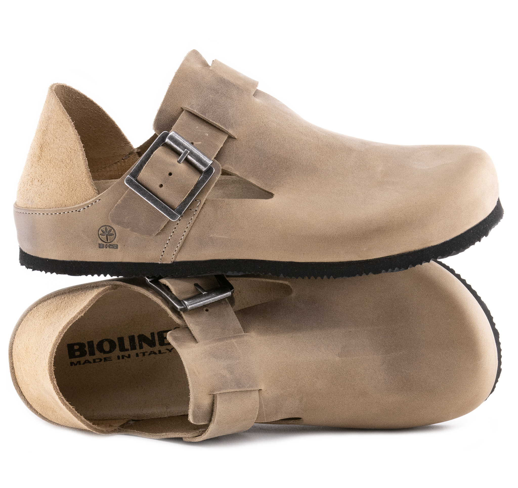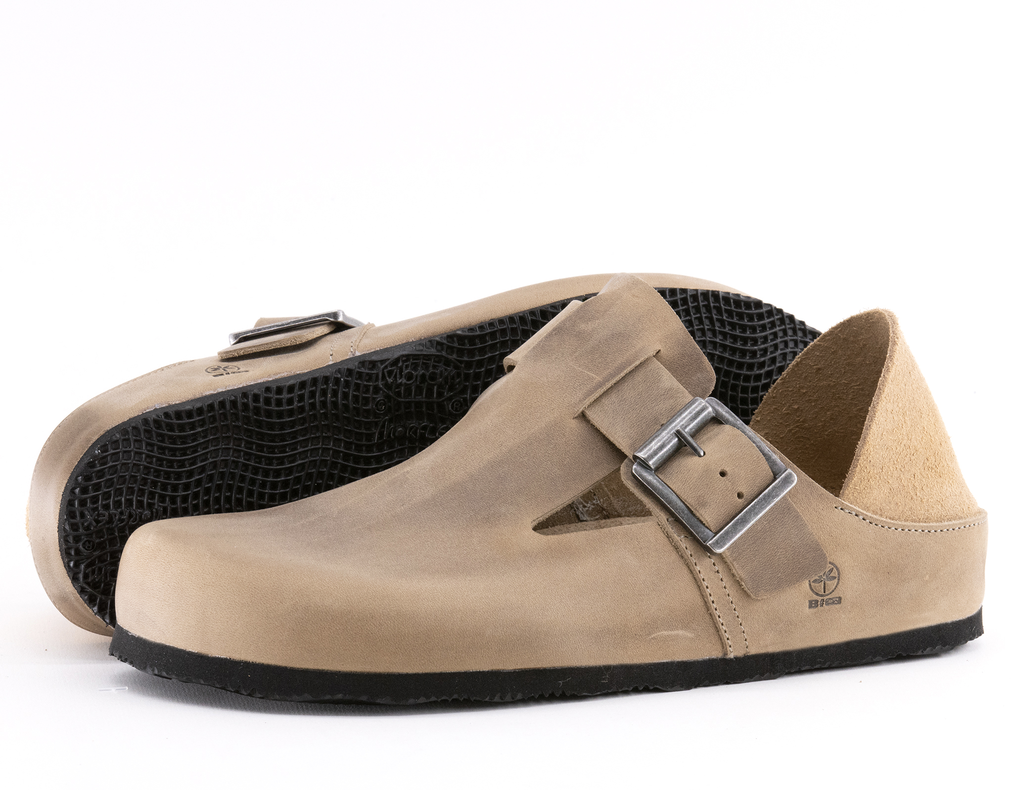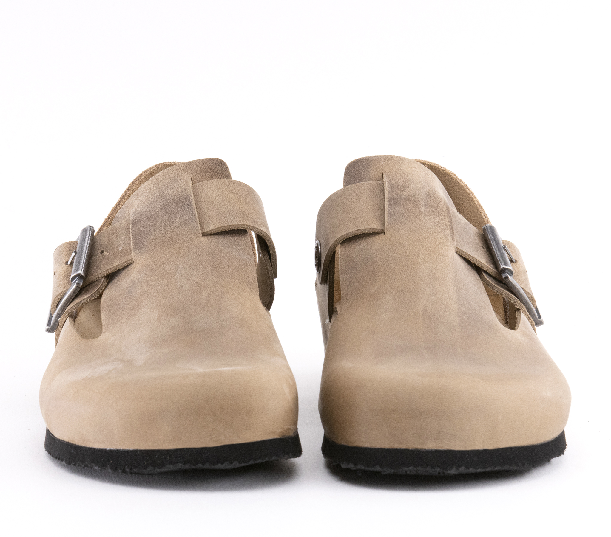Scarpetta in pelle ingrassata con fibbia e tallonetta in pelle scamosciata doppia funzione. Sottopiede gomma-sughero fisso, suola micro Vibram® 8mm.