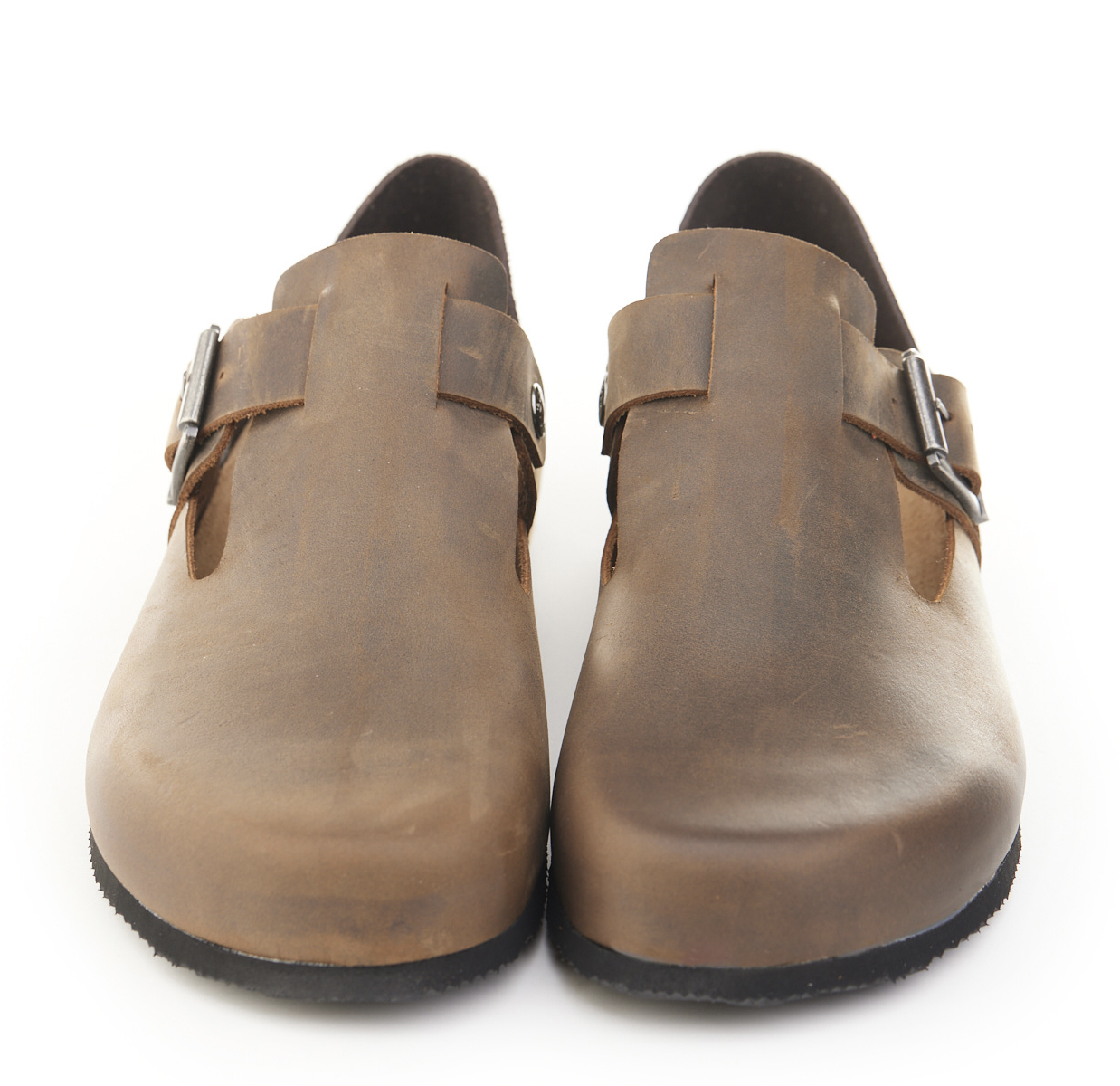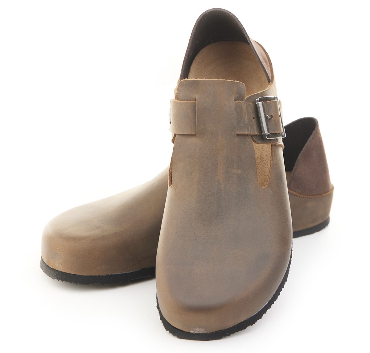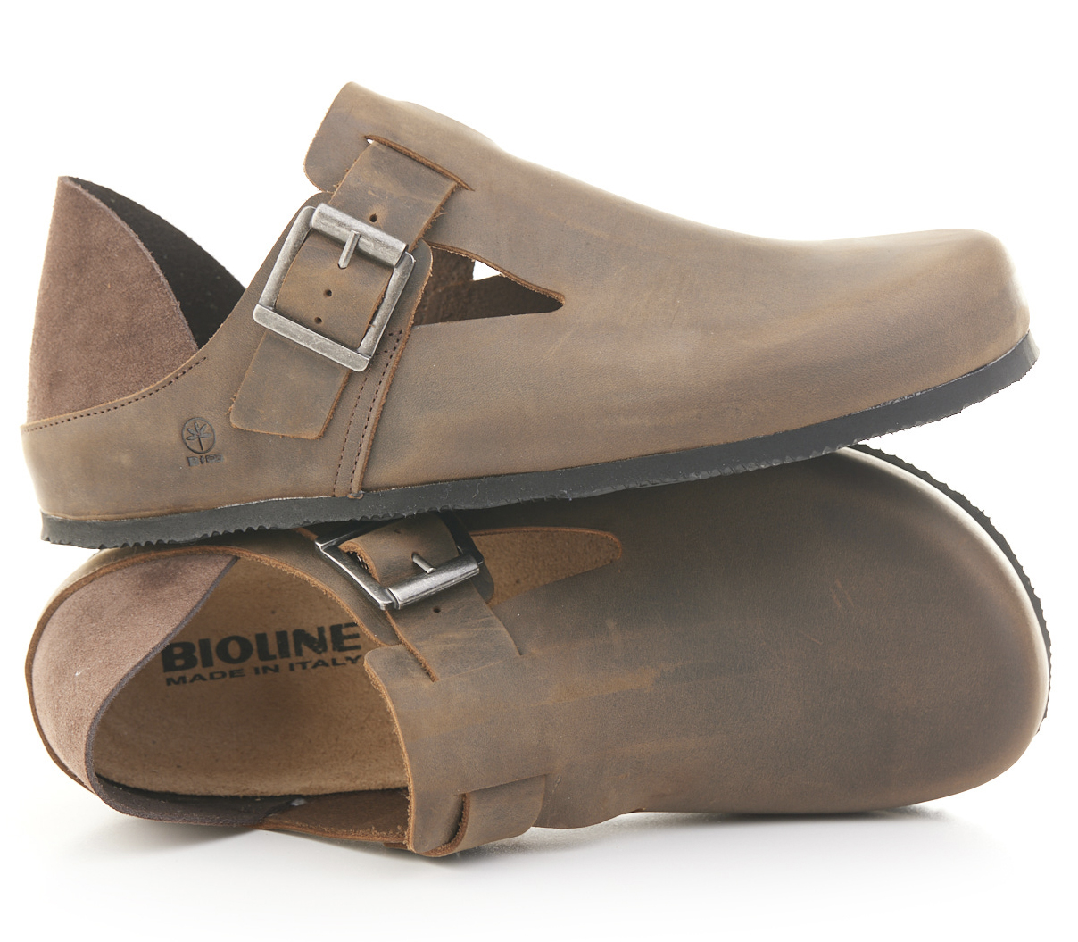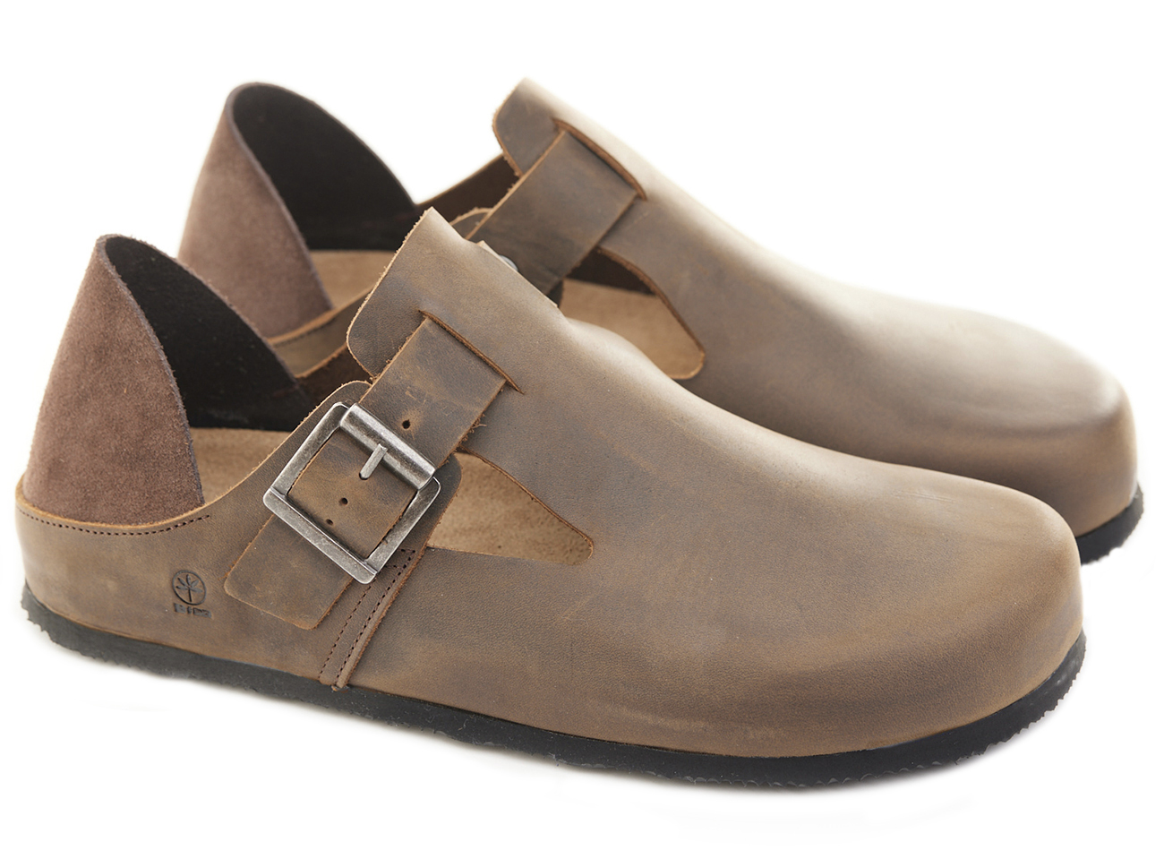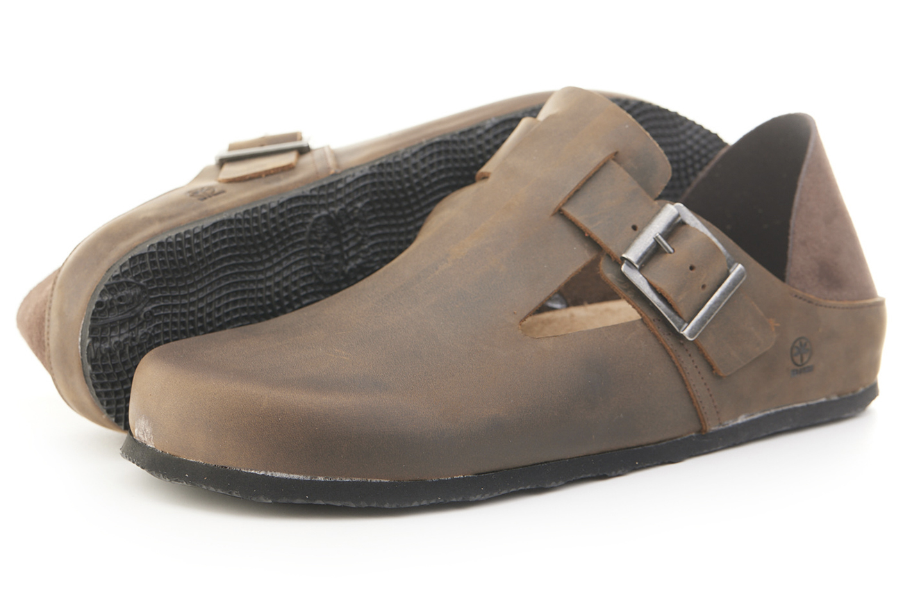 Scarpetta in pelle ingrassata con fibbia e tallonetta in pelle scamosciata doppia funzione. Sottopiede gomma-sughero fisso, suola micro Vibram® 8mm.
