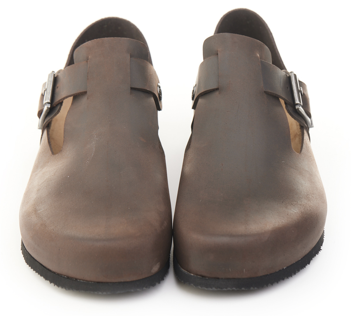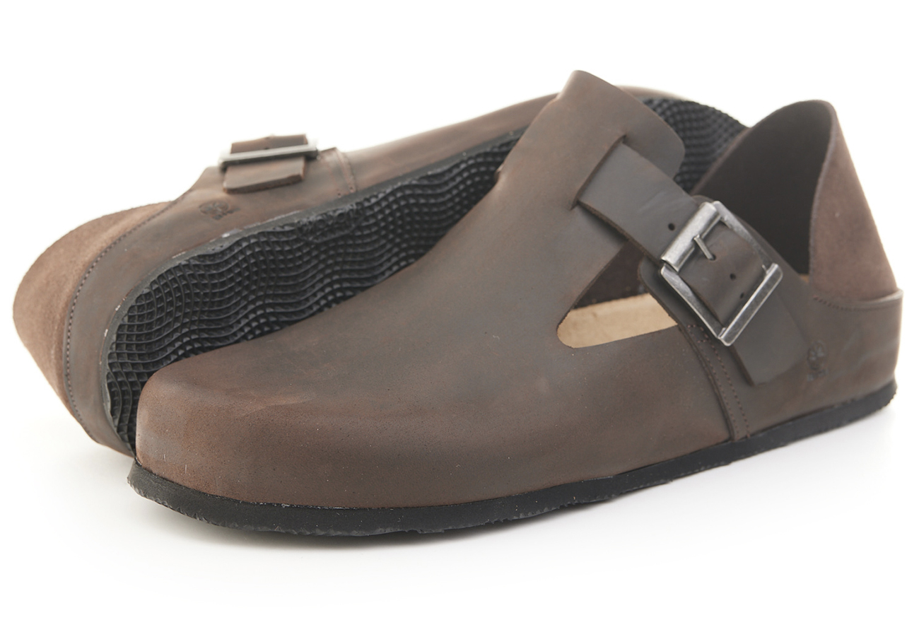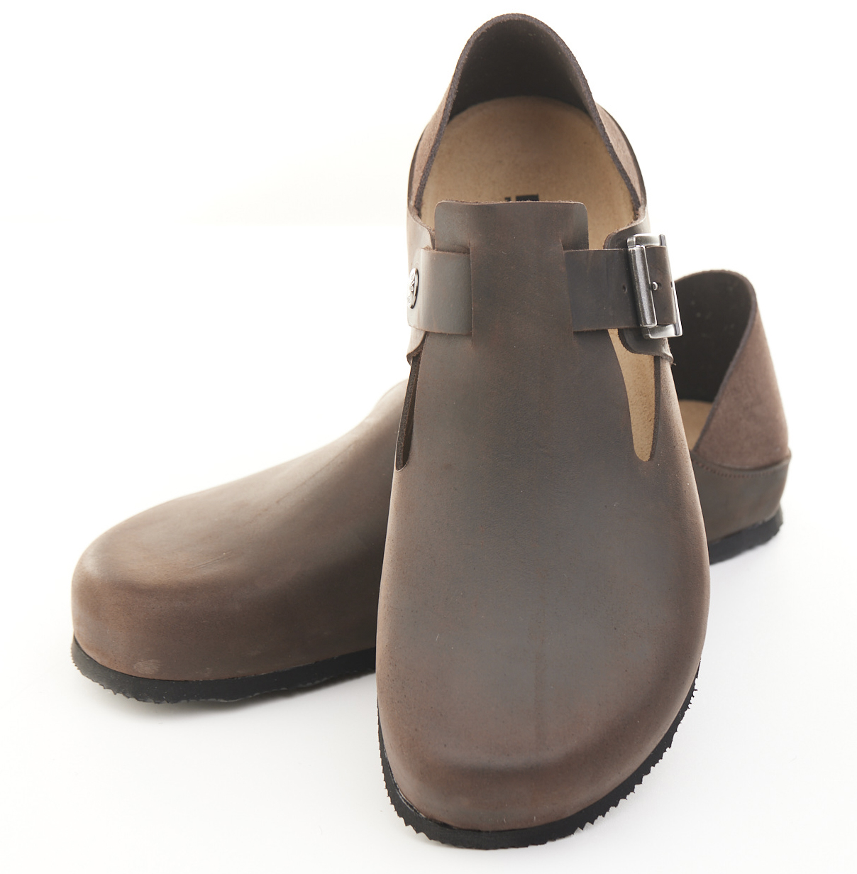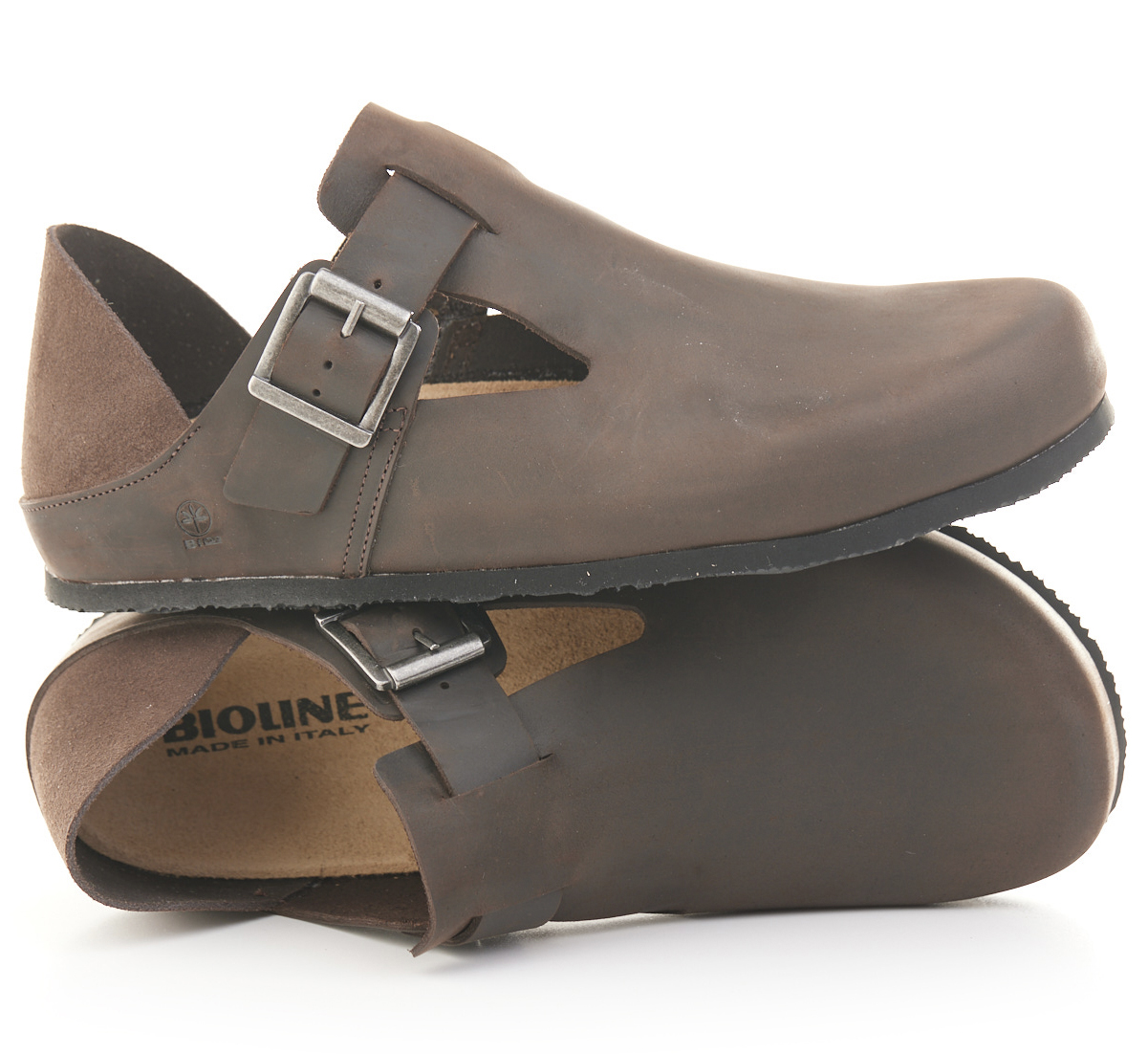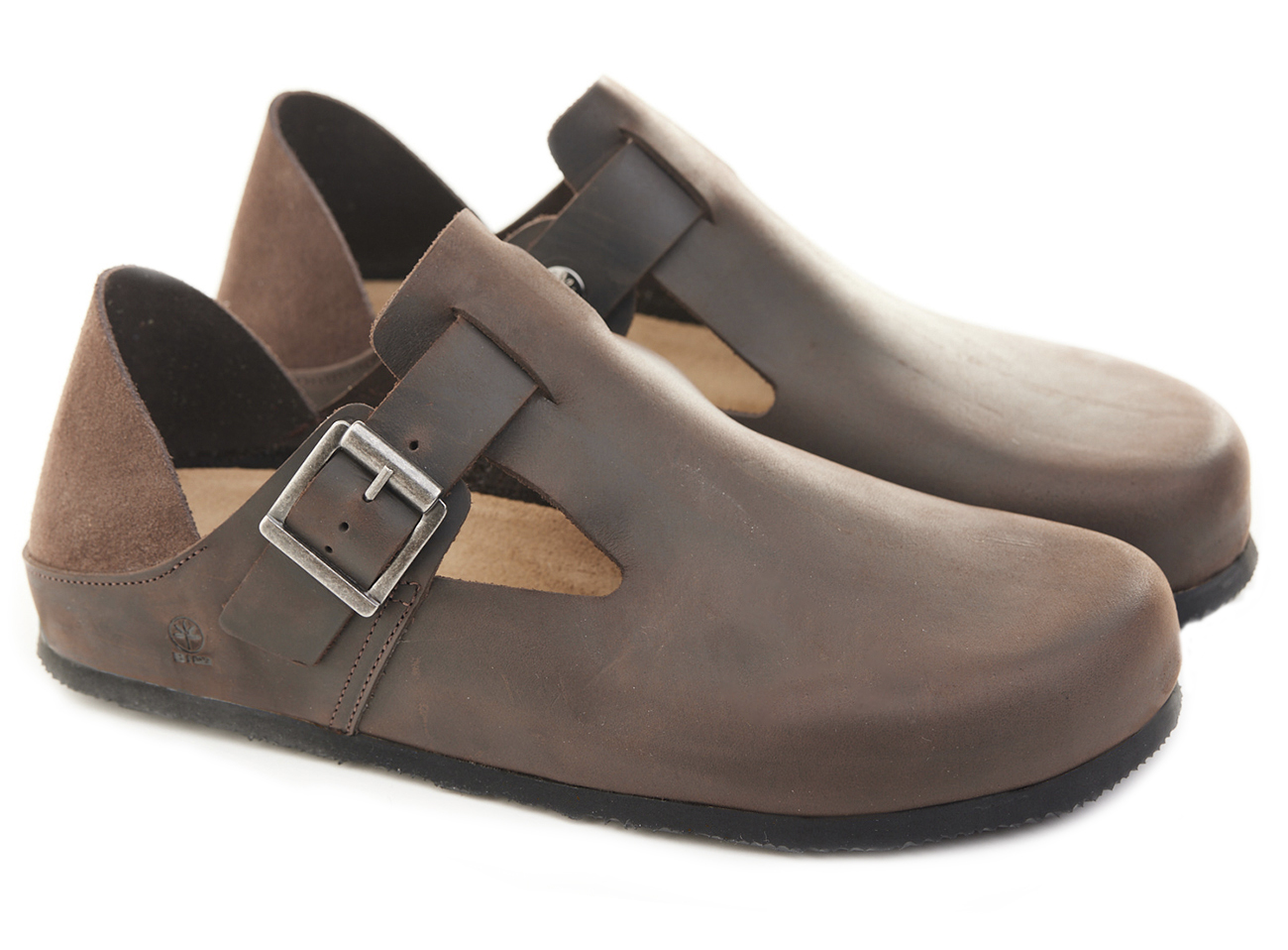 Scarpetta in pelle ingrassata con fibbia e tallonetta in pelle scamosciata doppia funzione. Sottopiede gomma-sughero fisso, suola micro Vibram® 8mm.