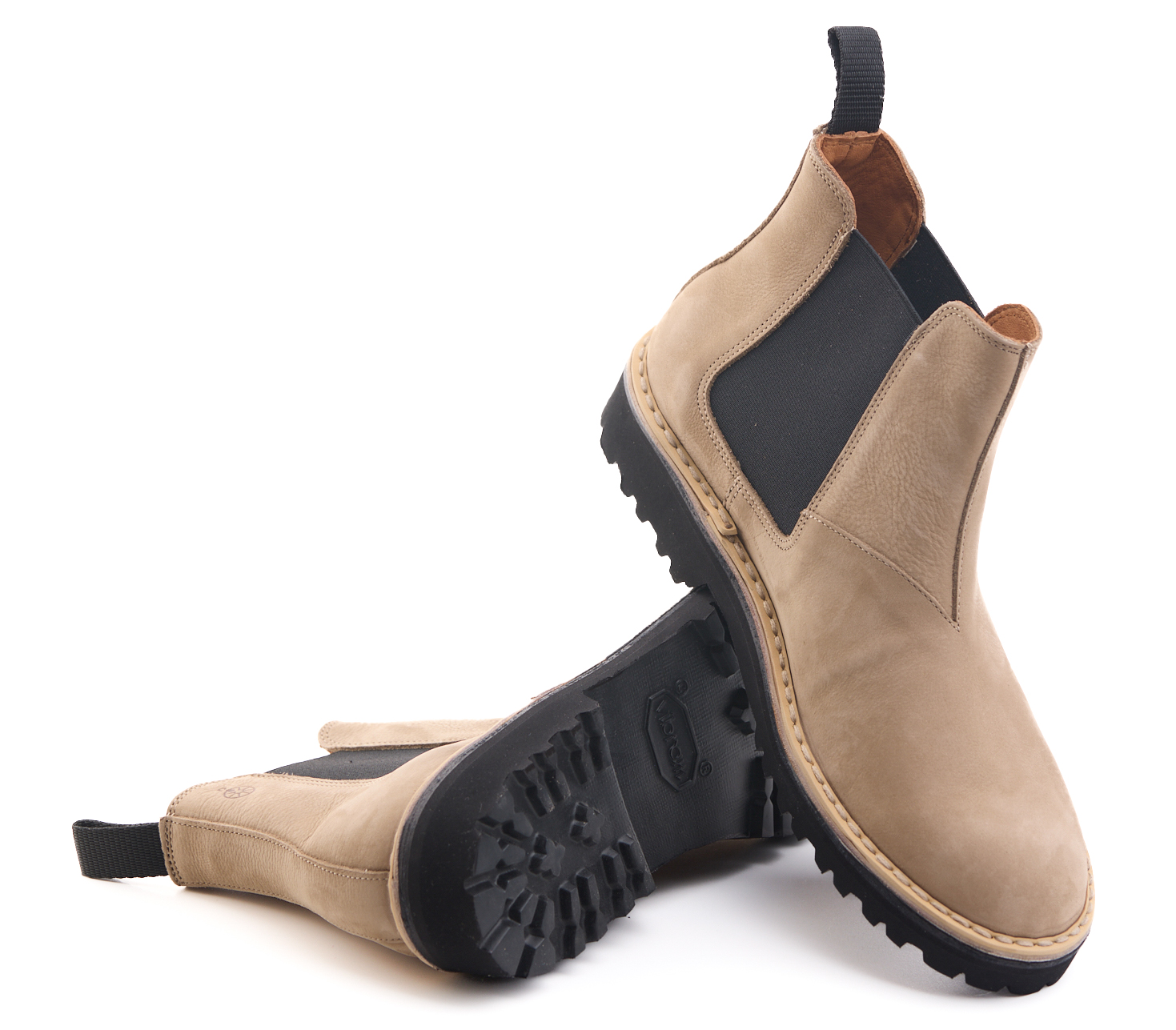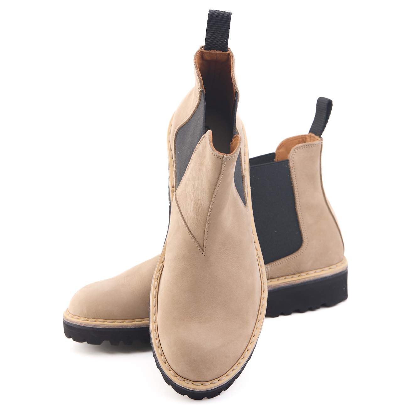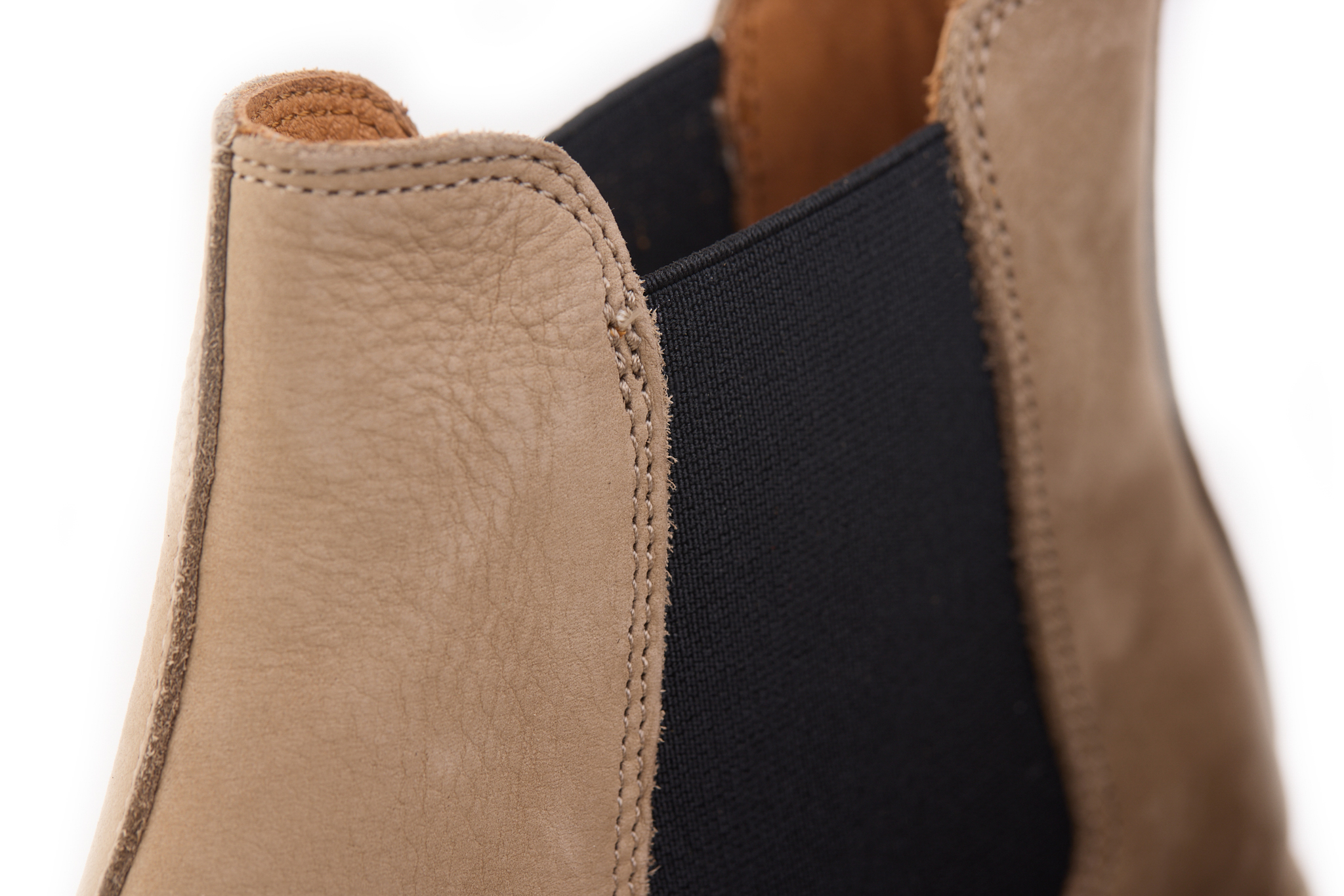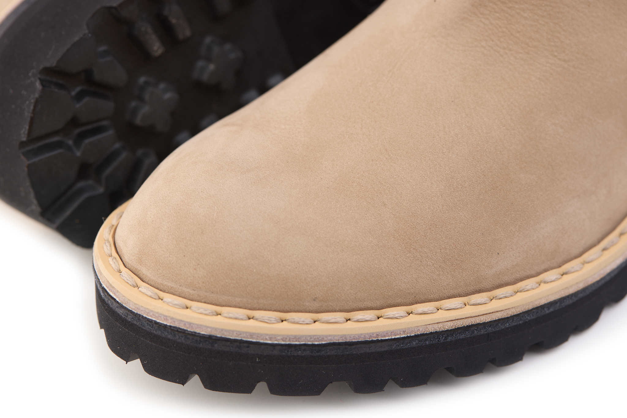Stivaletto Beatle lavorazione Ideal realizzato interamente a mano con tomaia in pelle nabuk pieno fiore e fodera in pelle vitello. Guardoli in cuoio, suola in gomma carrarmato Vibram® Light.