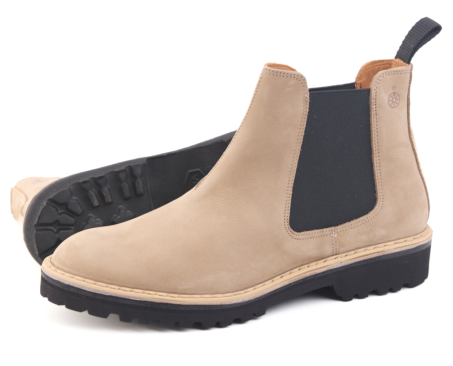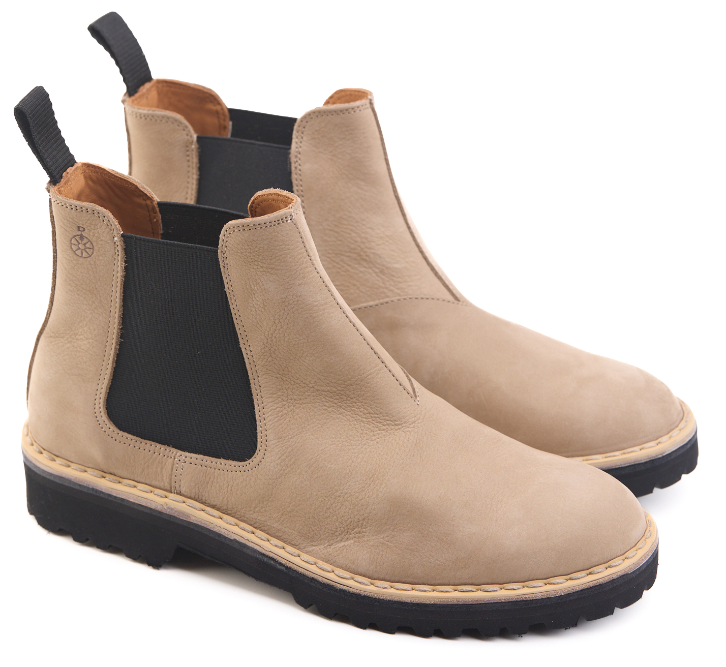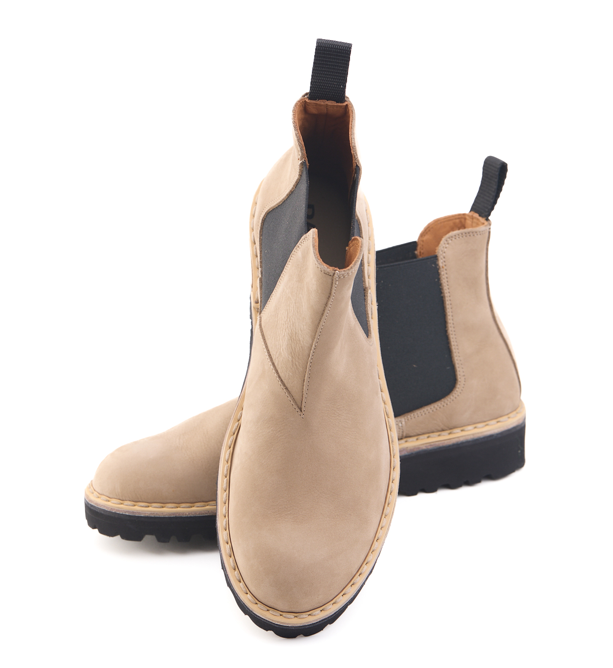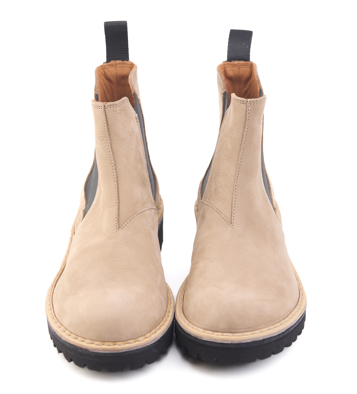Stivaletto Beatle lavorazione Ideal realizzato interamente a mano con tomaia in pelle nabuk pieno fiore e fodera in pelle vitello. Guardoli in cuoio, suola in gomma carrarmato Vibram® Light.