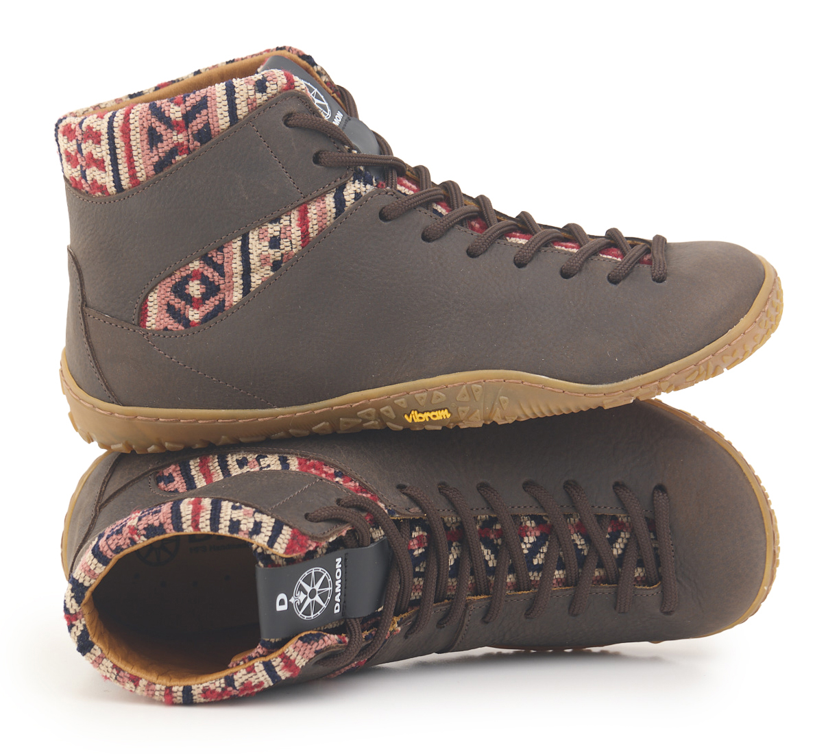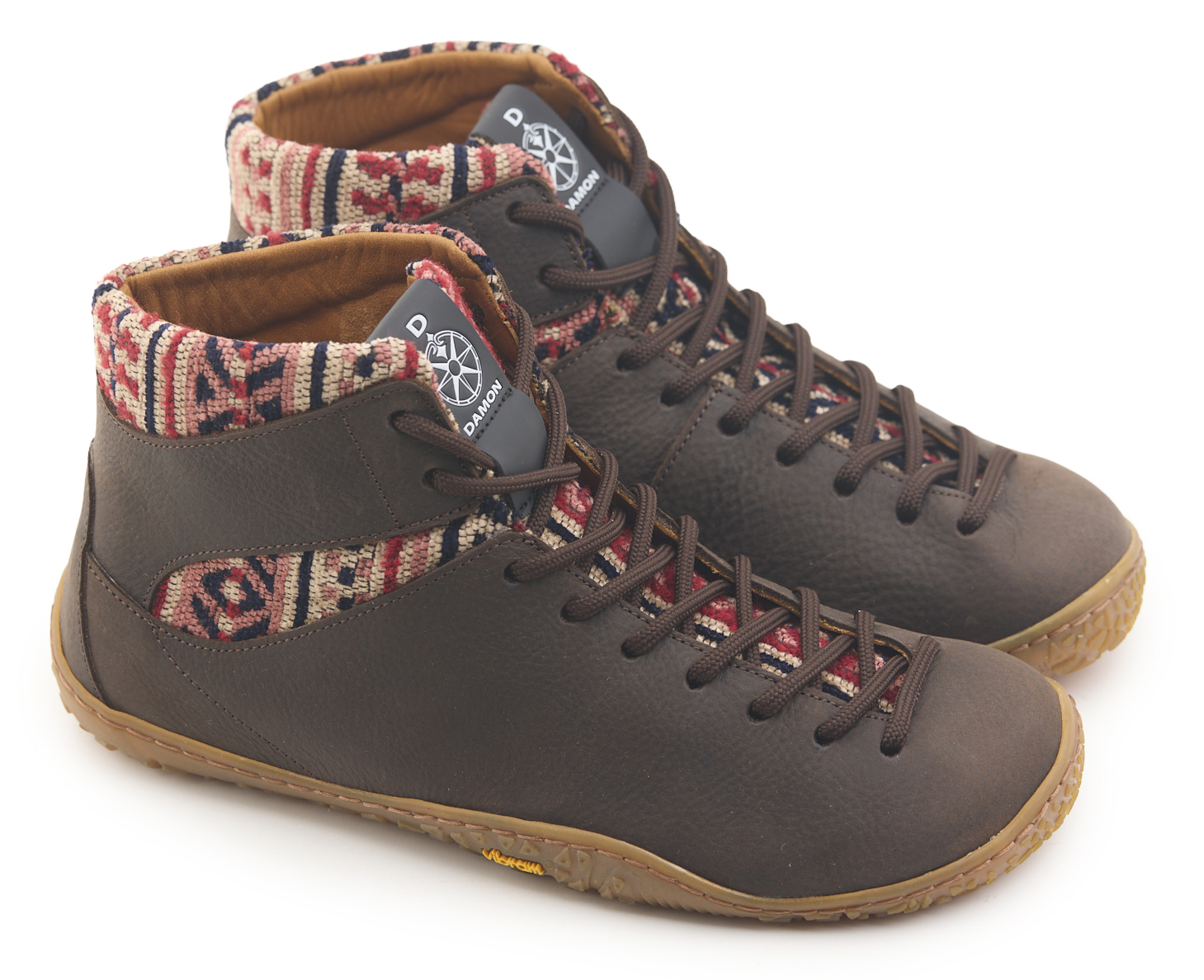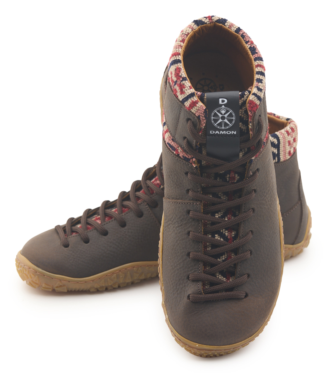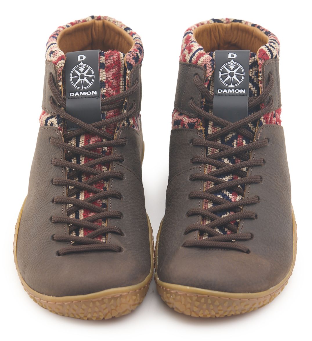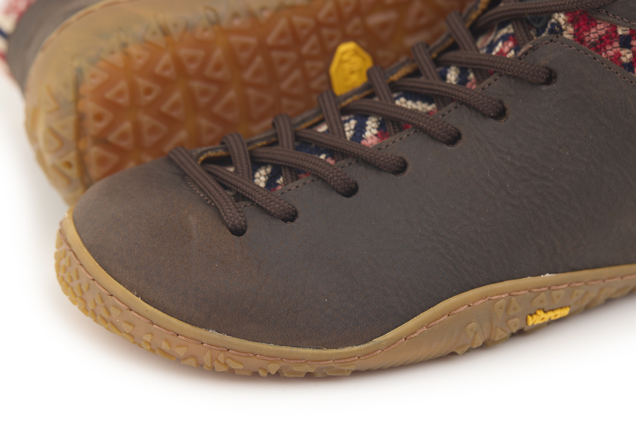 Stivaletto barefoot realizzato in pelle ingrassata e bottalata, fodera in pelle vitello, inserti in tessuto etnico e lacci stringati.