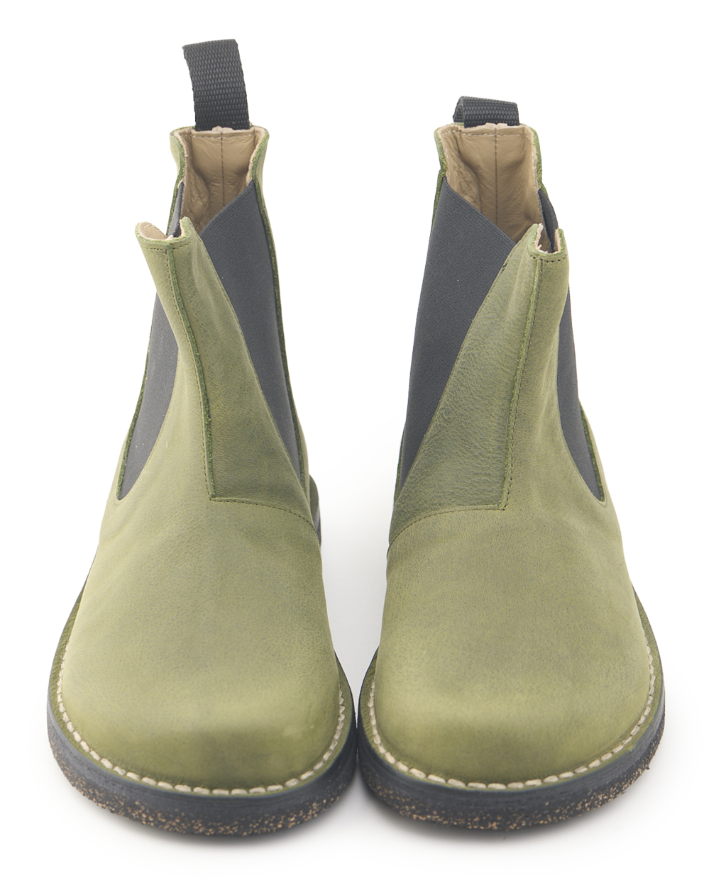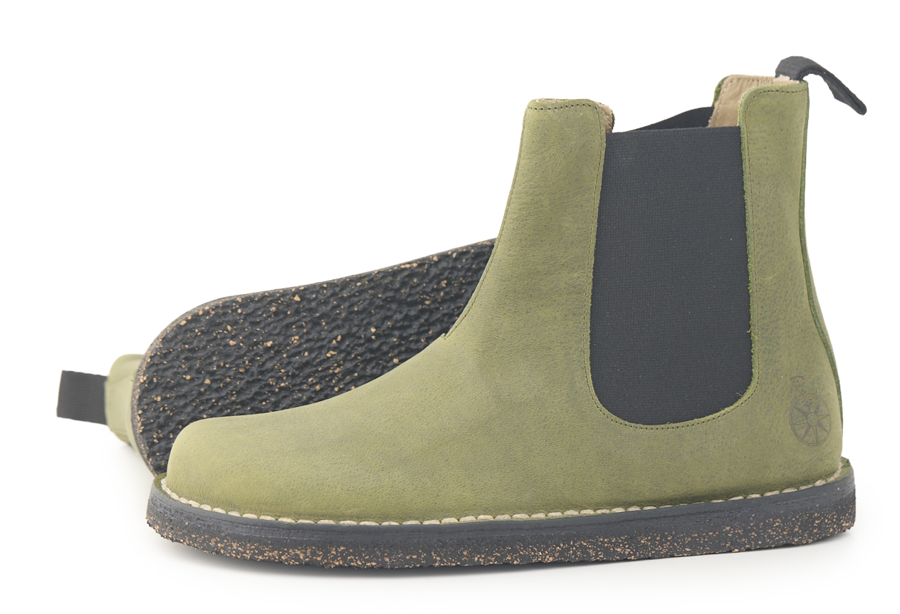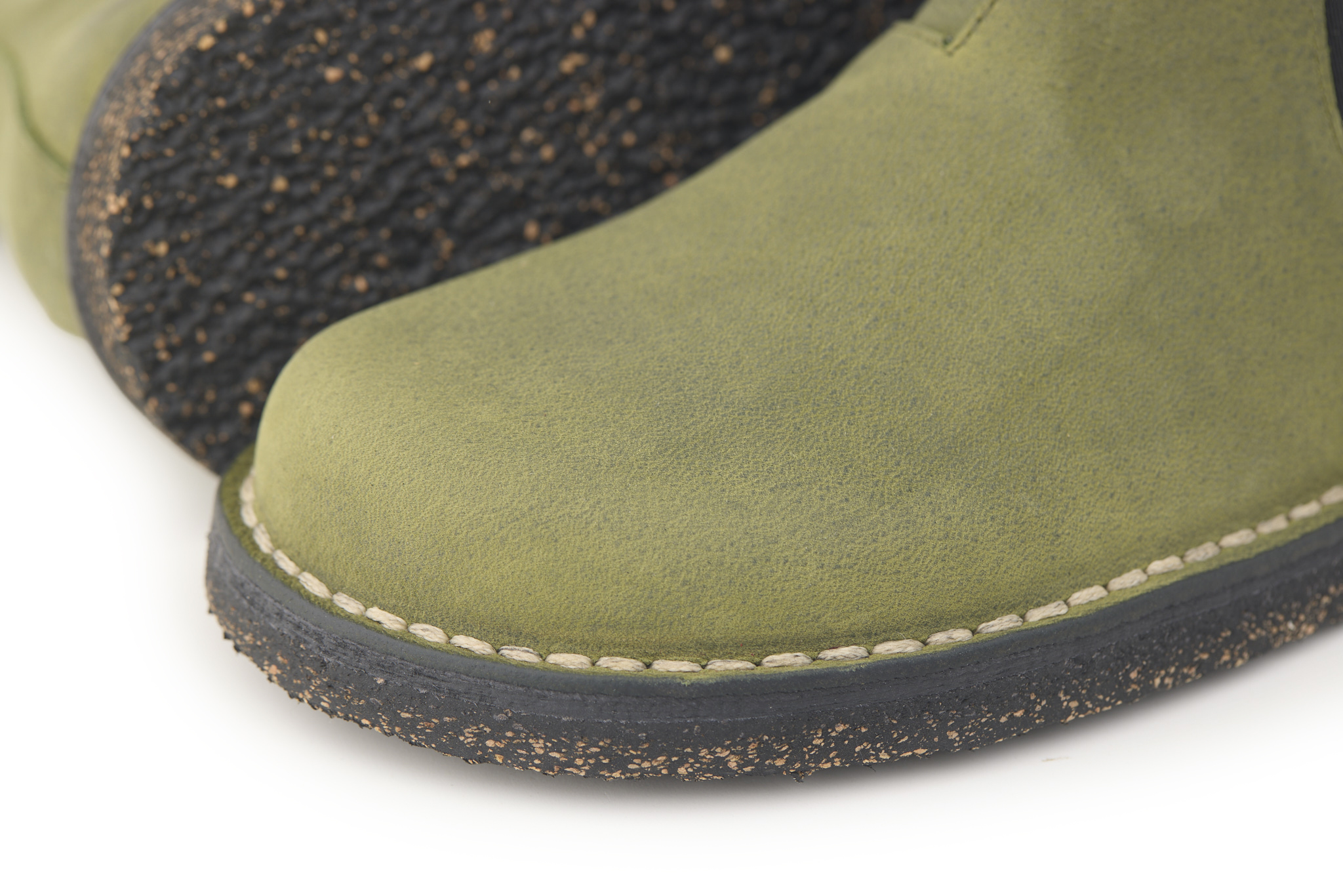 Stivaletto comfort lavorazione Ideal realizzata interamente a mano con tomaia in pelle nabuk pieno fiore oliato e bottalato, fodera in pelle vitello, elastico laterale e linguetta sul tallone. Suola a zeppa in gomma-sughero riciclato.