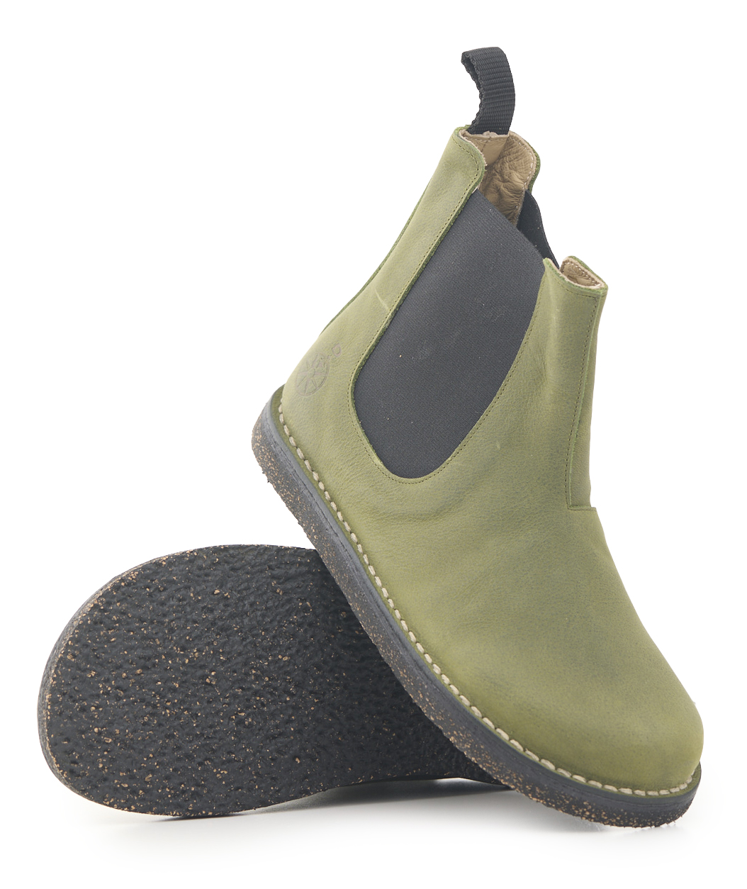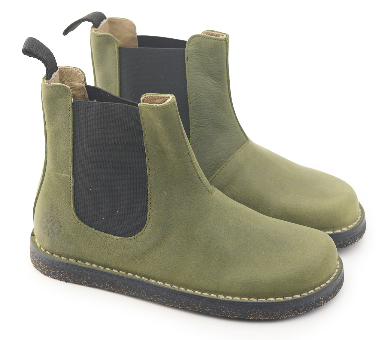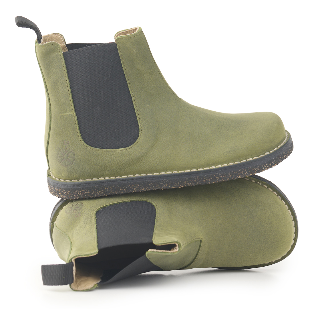 Stivaletto comfort lavorazione Ideal realizzata interamente a mano con tomaia in pelle nabuk pieno fiore oliato e bottalato, fodera in pelle vitello, elastico laterale e linguetta sul tallone. Suola a zeppa in gomma-sughero riciclato.