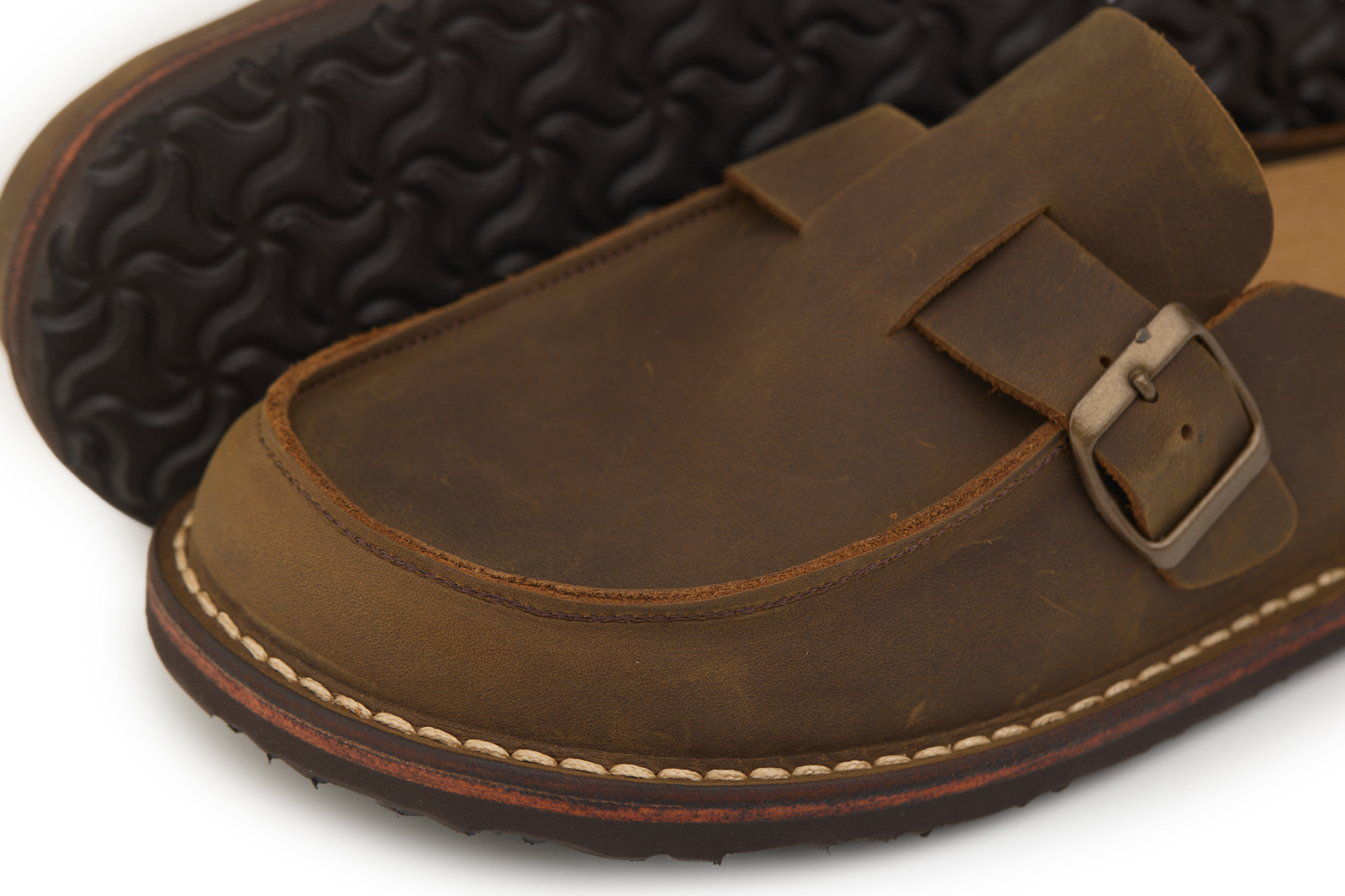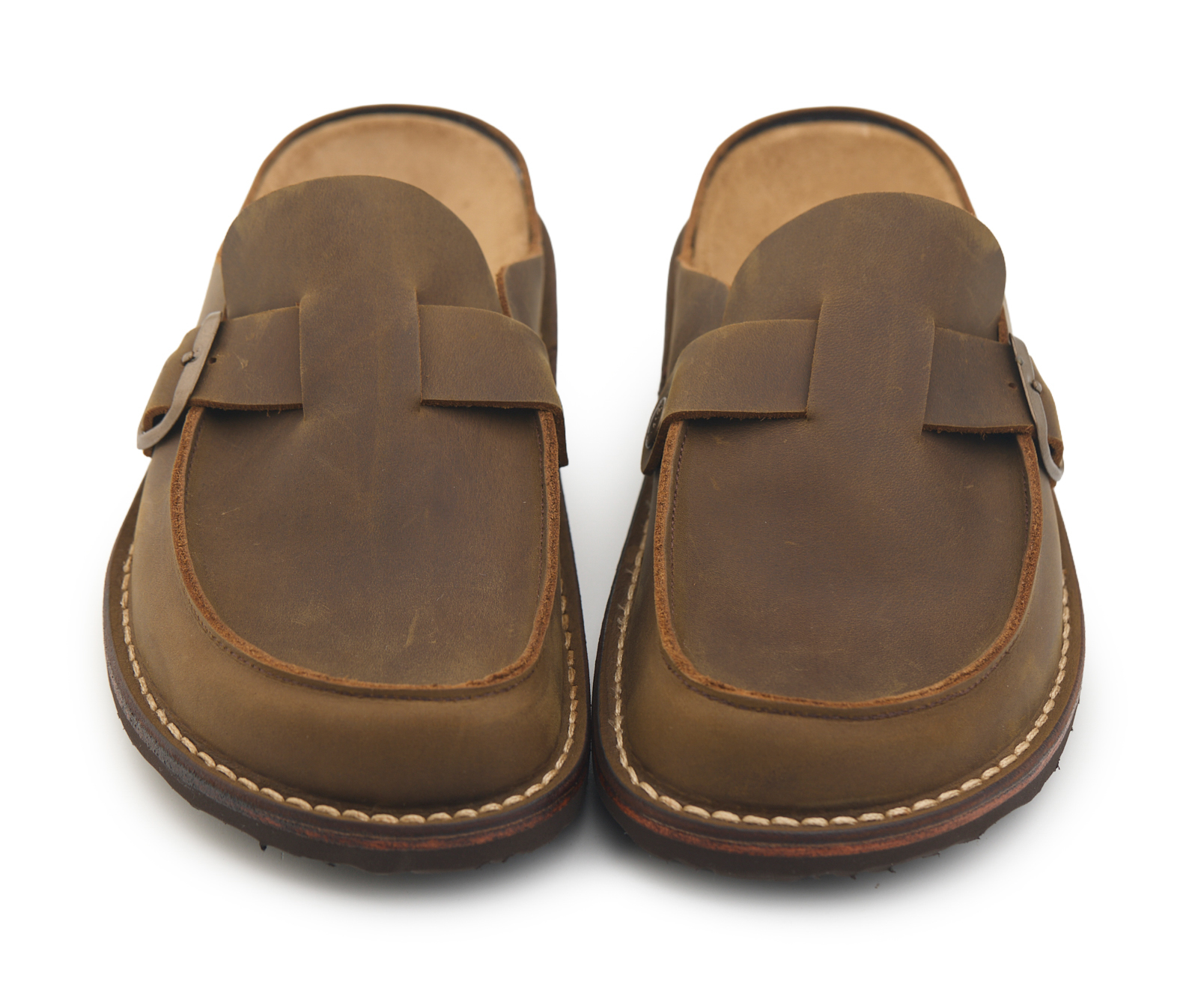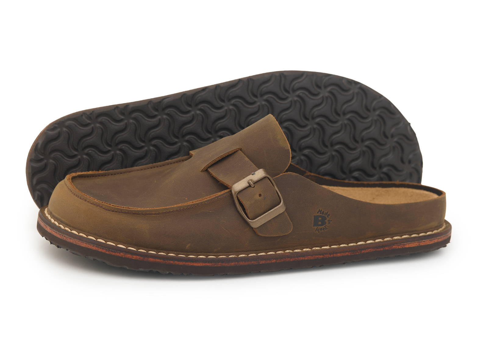 Sabot semiaperto in stile mocassino realizzato in pelle nabuk ingrassato, lavorazione Ideal e cinturino regolabile con fibbia color ottone.
