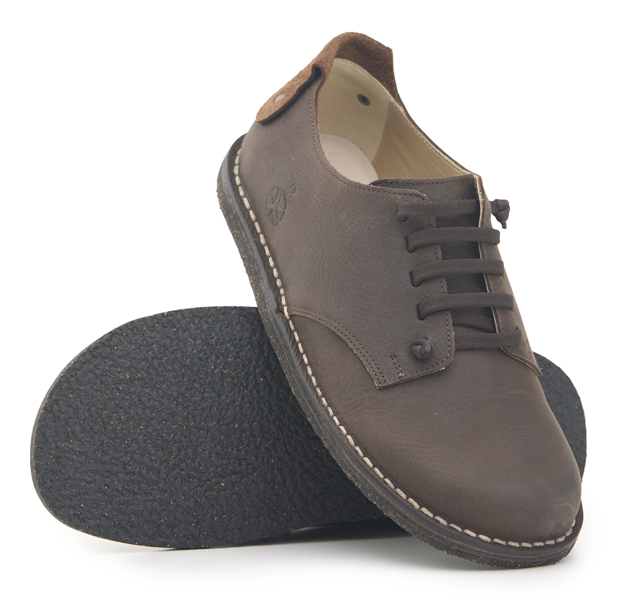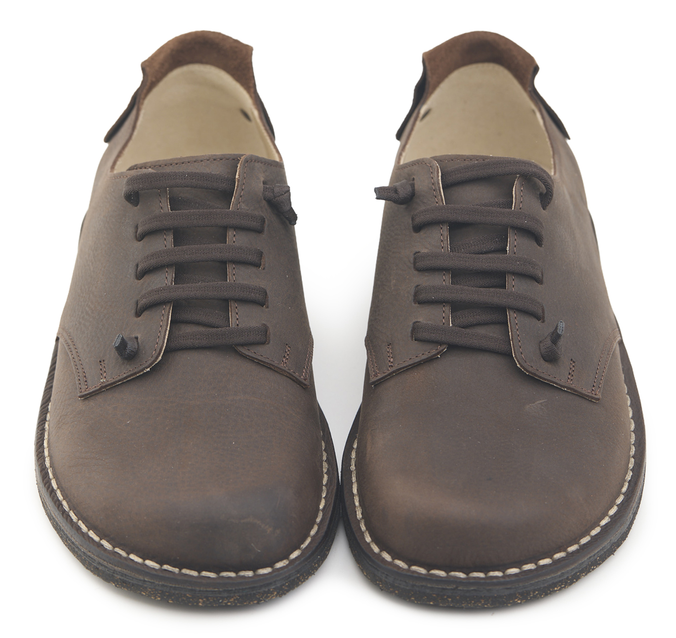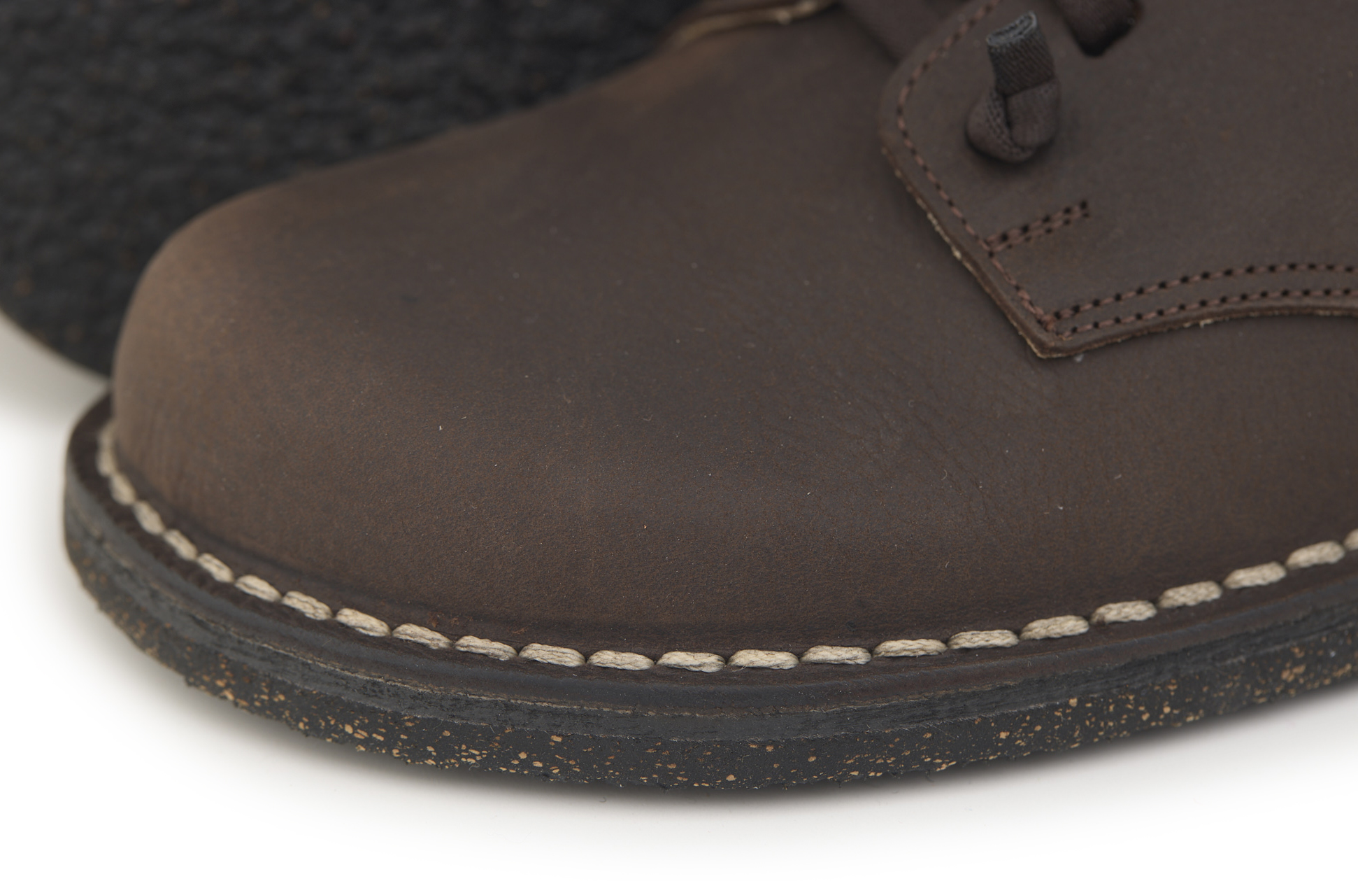 Scarpetta comfort lavorazione Ideal realizzata interamente a mano con tomaia in pelle nabuk pieno fiore oliato e bottalato e fodera in pelle vitello. Suola a zeppa in gomma-sughero riciclato.