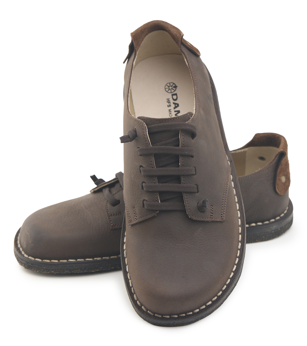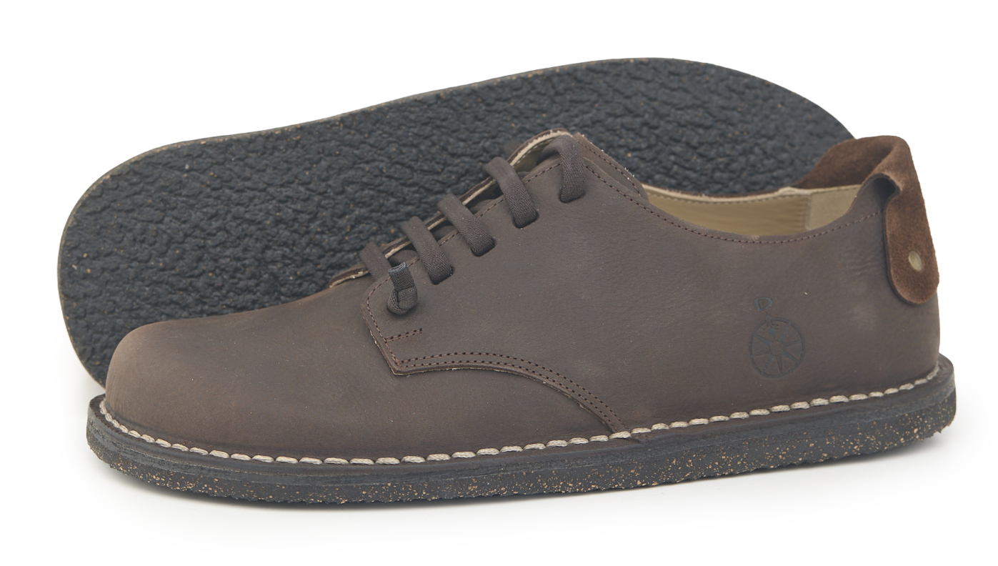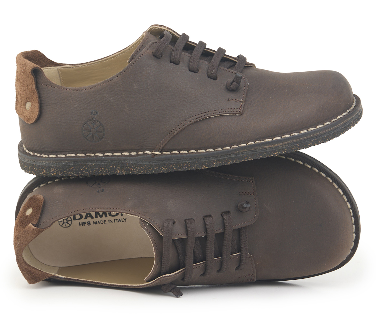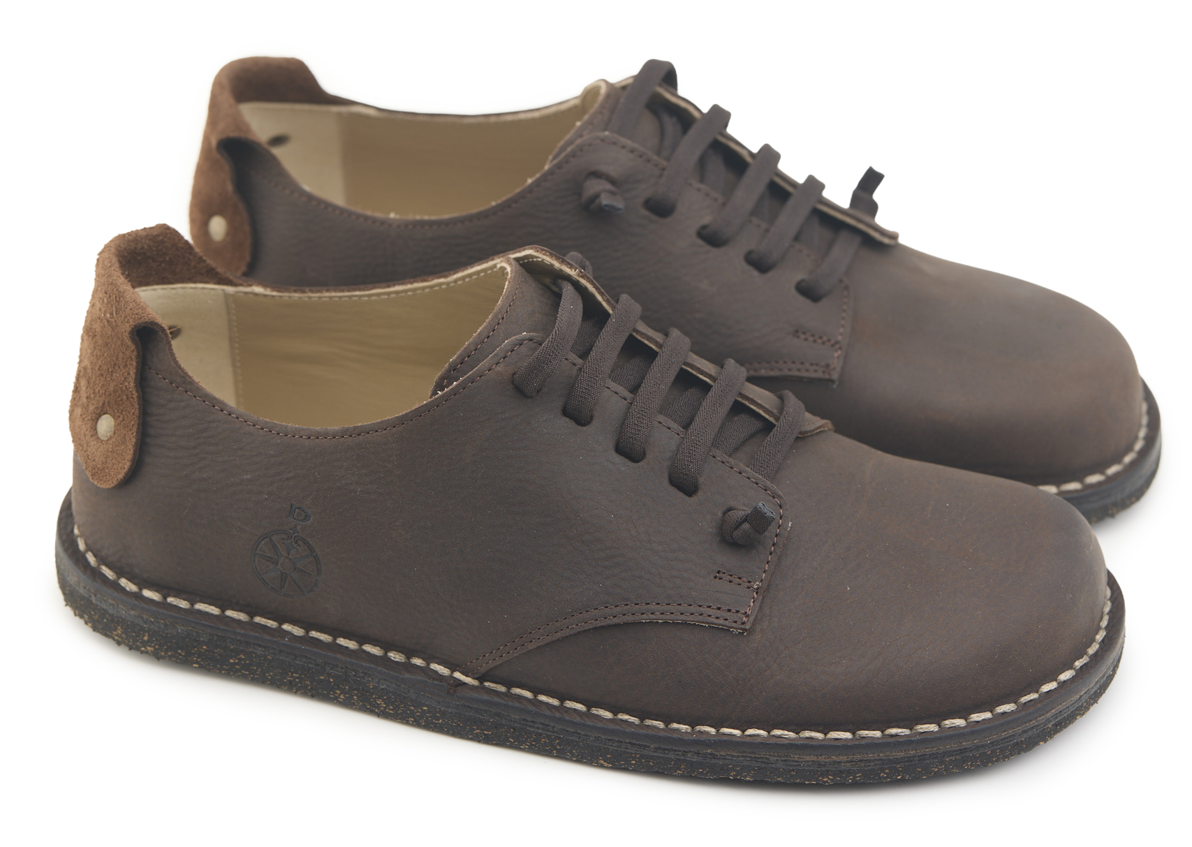 Scarpetta comfort lavorazione Ideal realizzata interamente a mano con tomaia in pelle nabuk pieno fiore oliato e bottalato e fodera in pelle vitello. Suola a zeppa in gomma-sughero riciclato.